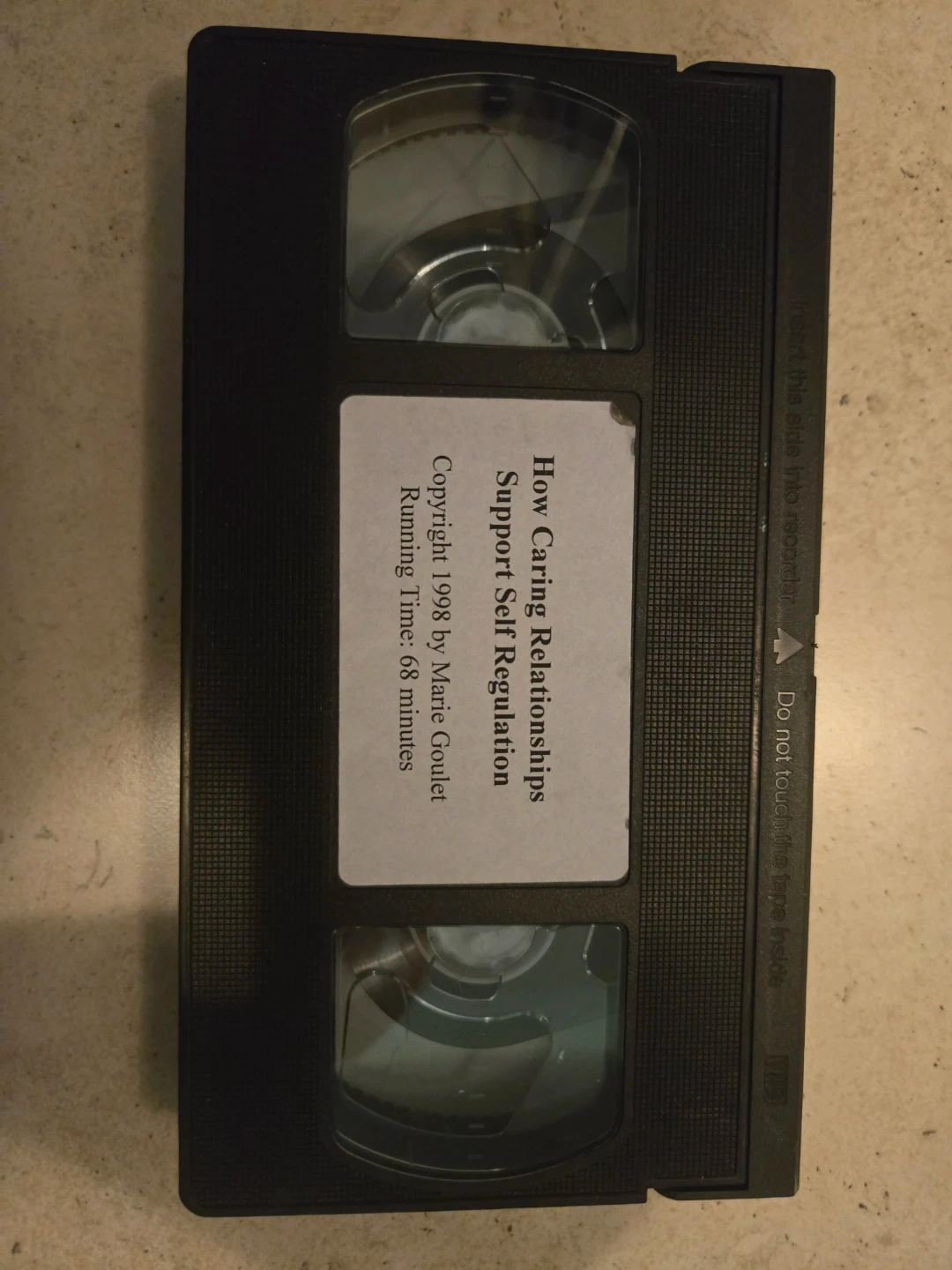Gifting a VHS tape titled "How Caring Relationships Support Self Regulation" by Marie Poulet. Copyright 1998. Running time is 68 minutes. Almost 30 years later, attachment theory is saying the same stuff!!