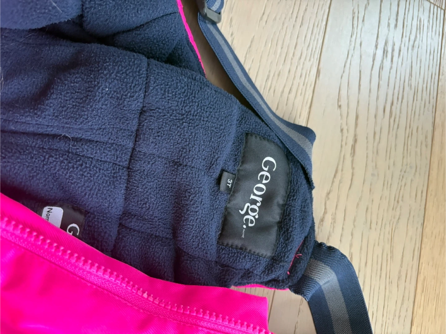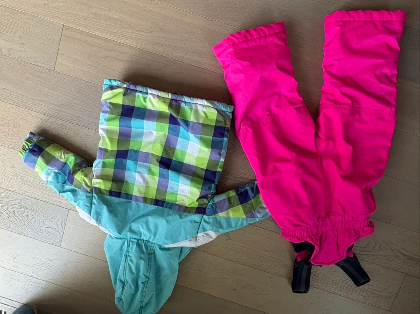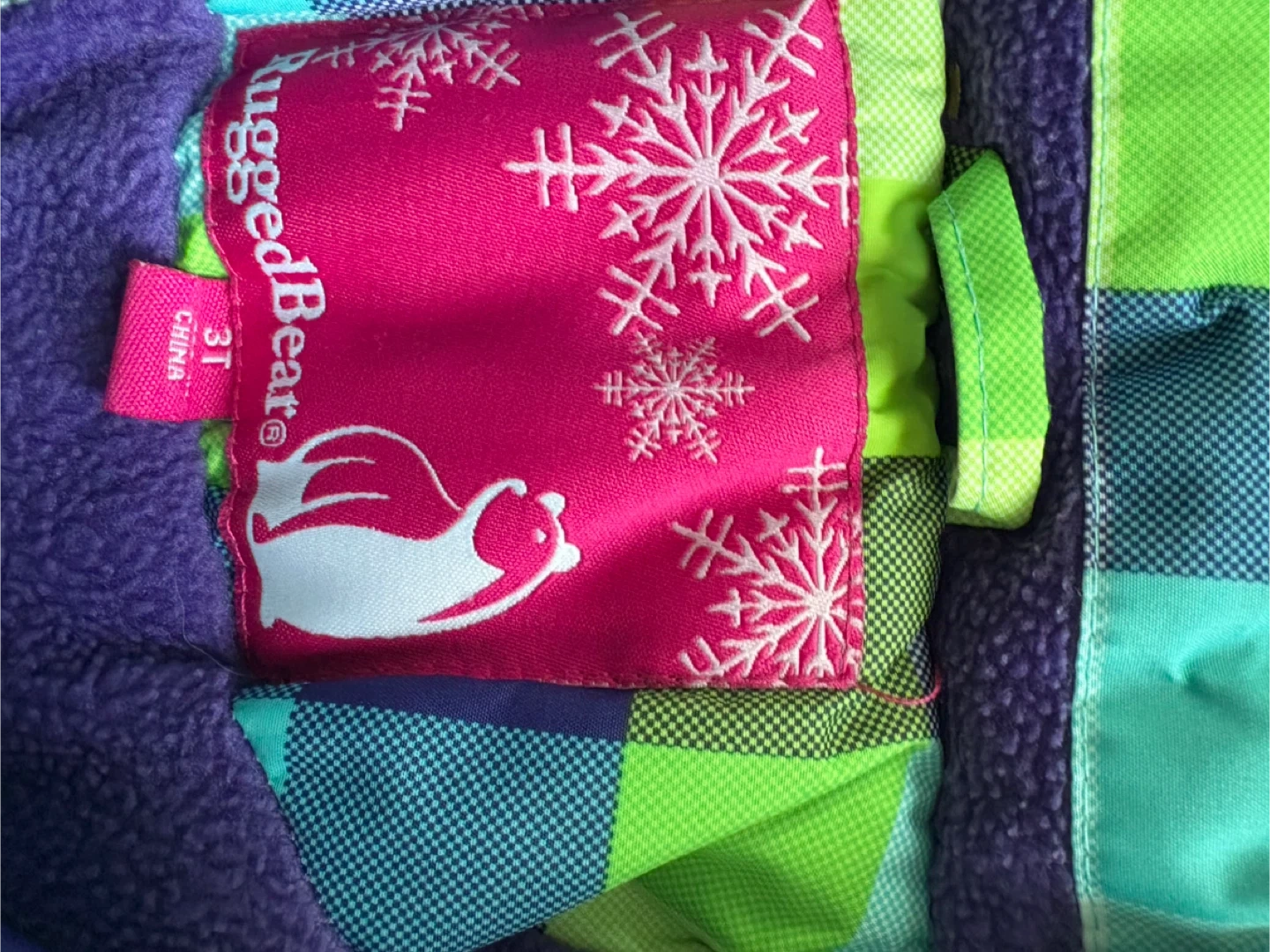 Here's a cute snowsuit set for your little one! It's a size 3T and includes both the jacket and snow pants. The jacket has a colourful plaid pattern, and the pants are a bright pink. Perfect for keeping your child warm and dry this winter season!