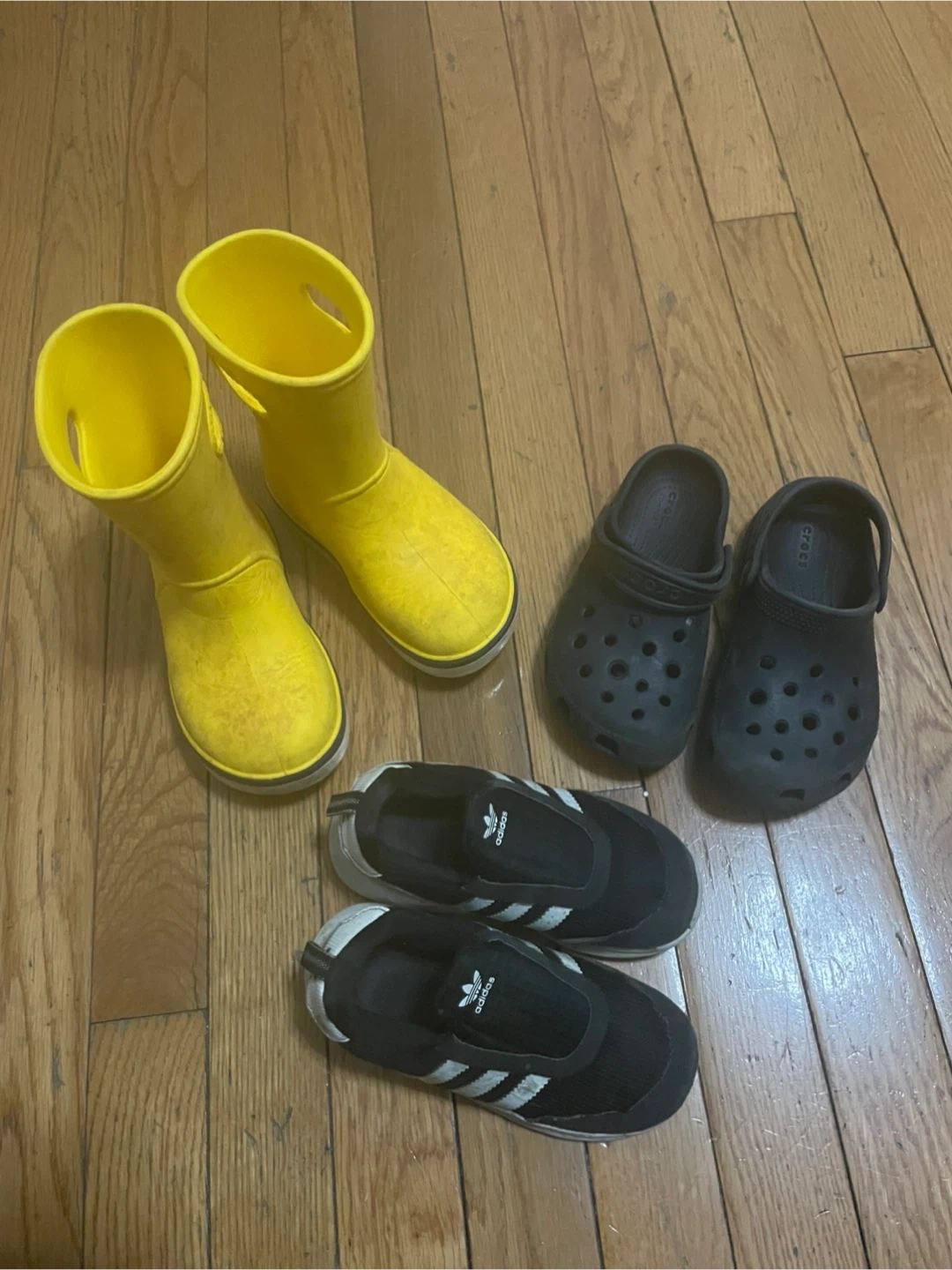 Selling a bundle of kids' footwear! Includes a pair of black Crocs, a pair of black Adidas shoes with white stripes, and a pair of yellow rain boots. Great condition and ready for a new owner!