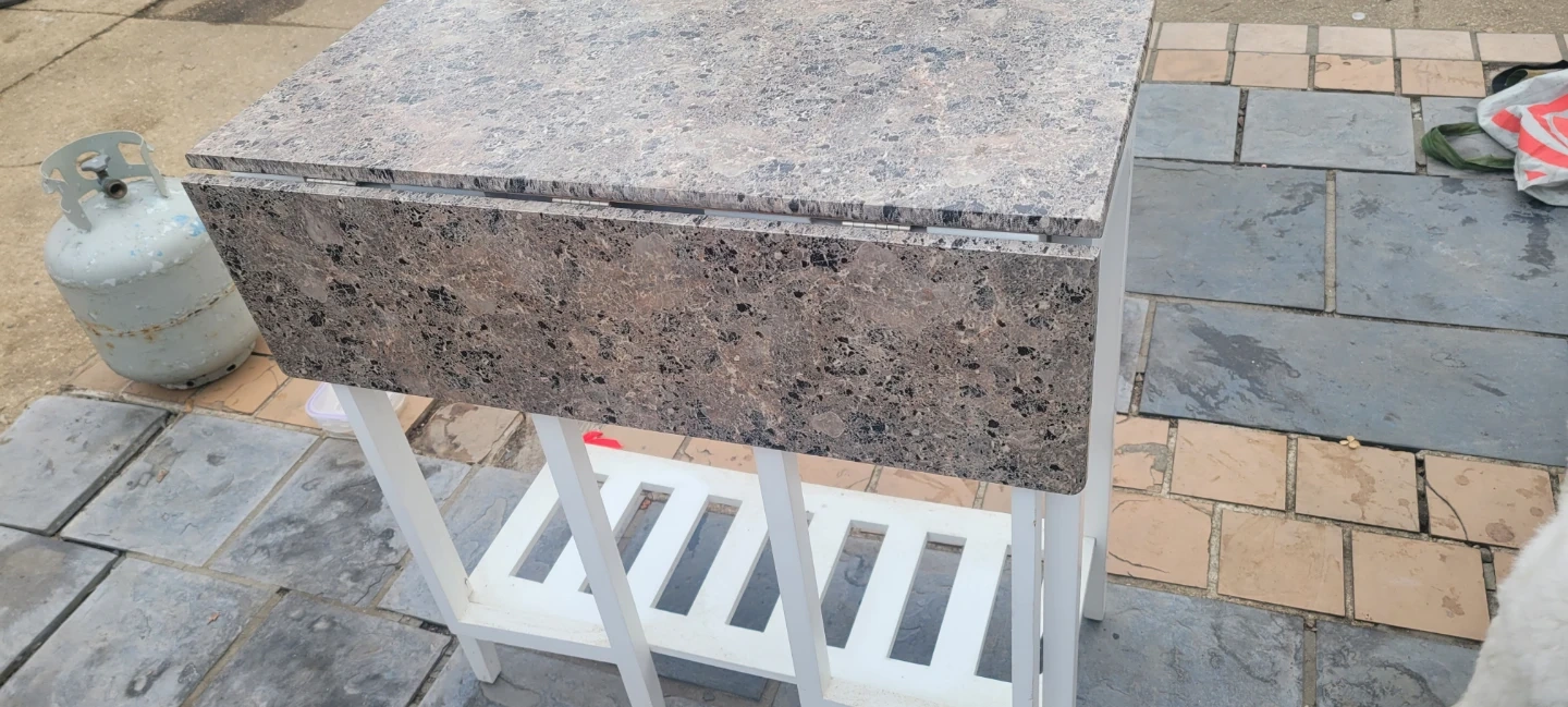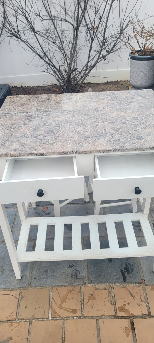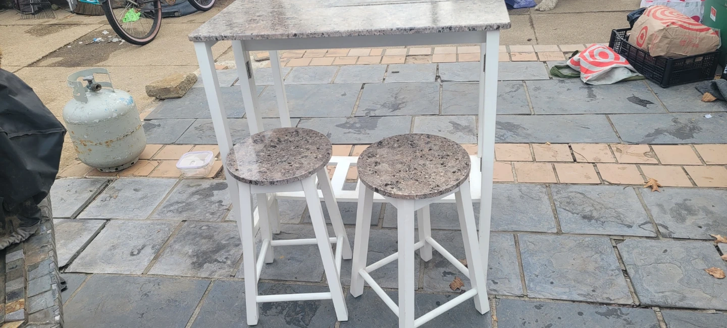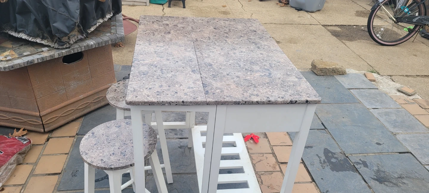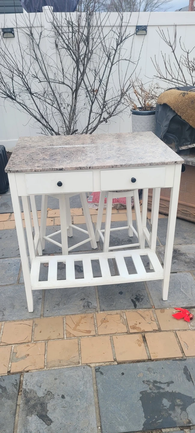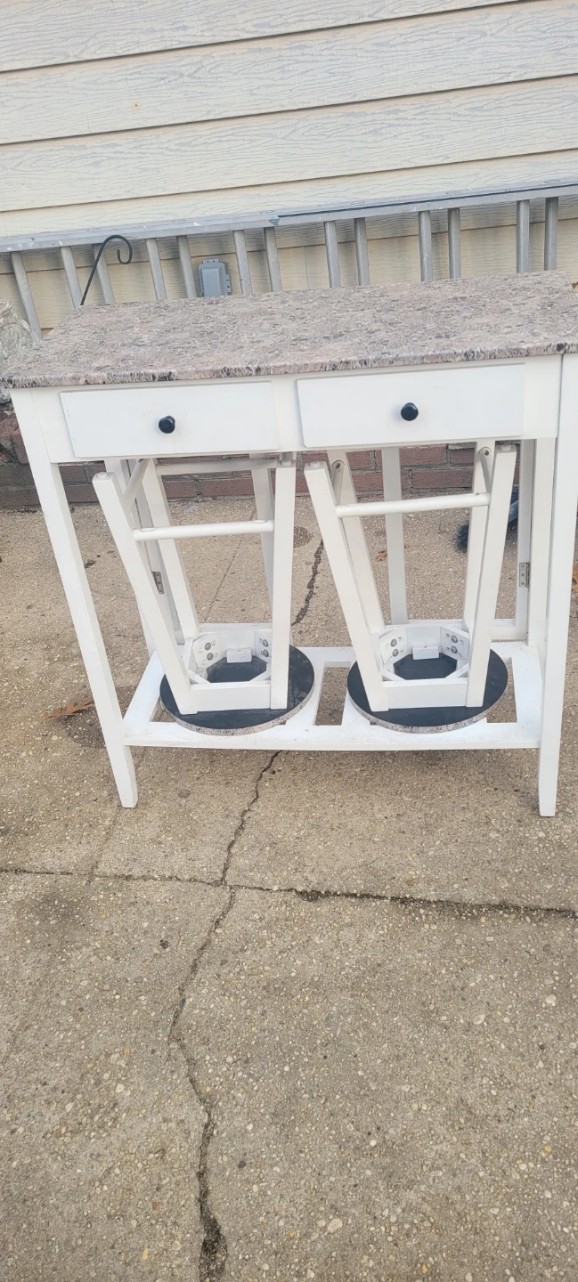 I'm selling a kitchen island table with two stools. The table has a drop leaf and a white frame with a faux granite top. The stools have matching faux granite tops and white frames. It's in good condition!