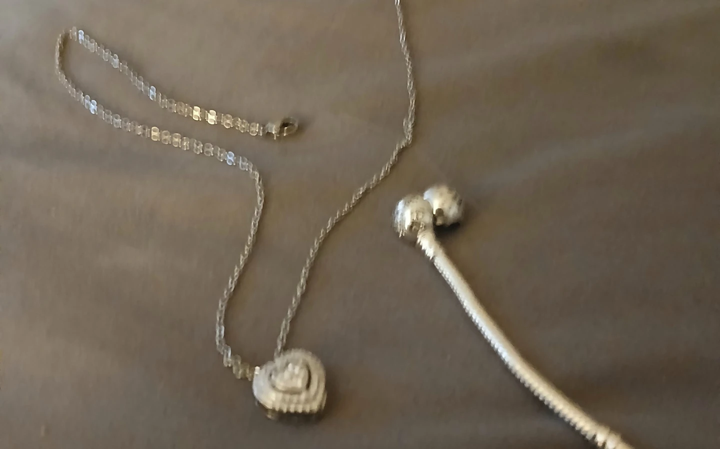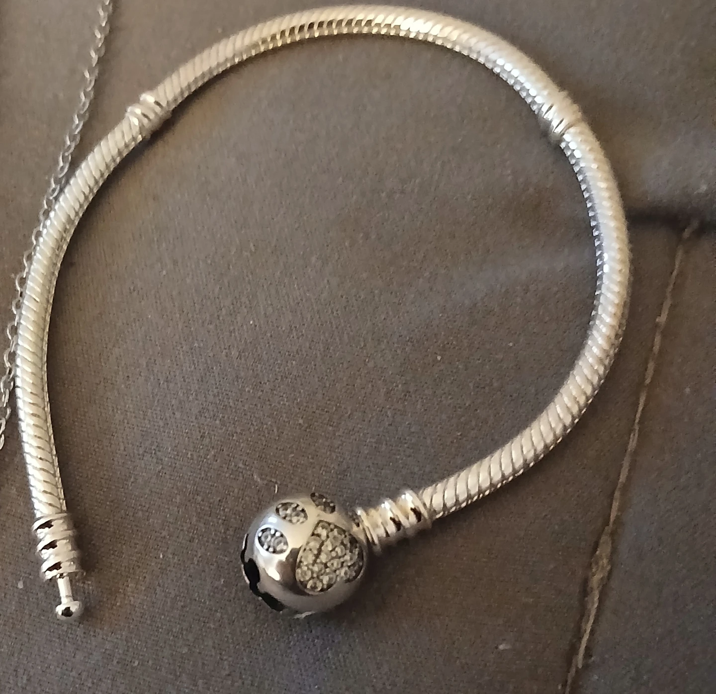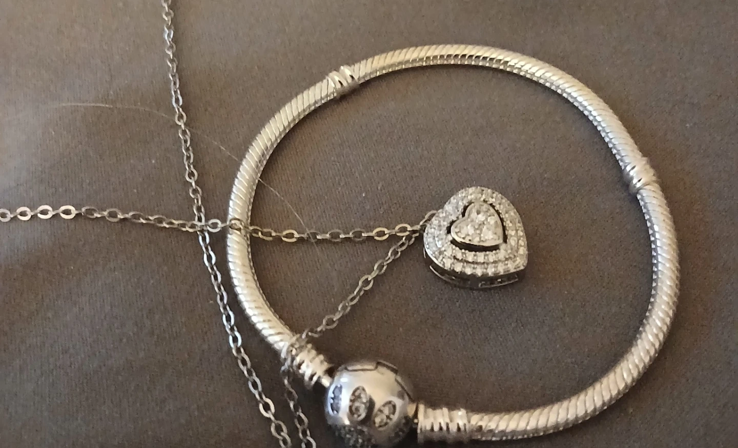 Selling a like pandora bracelet silver tone bracelet and necklace. Both are in good condition and ready for a new owner!