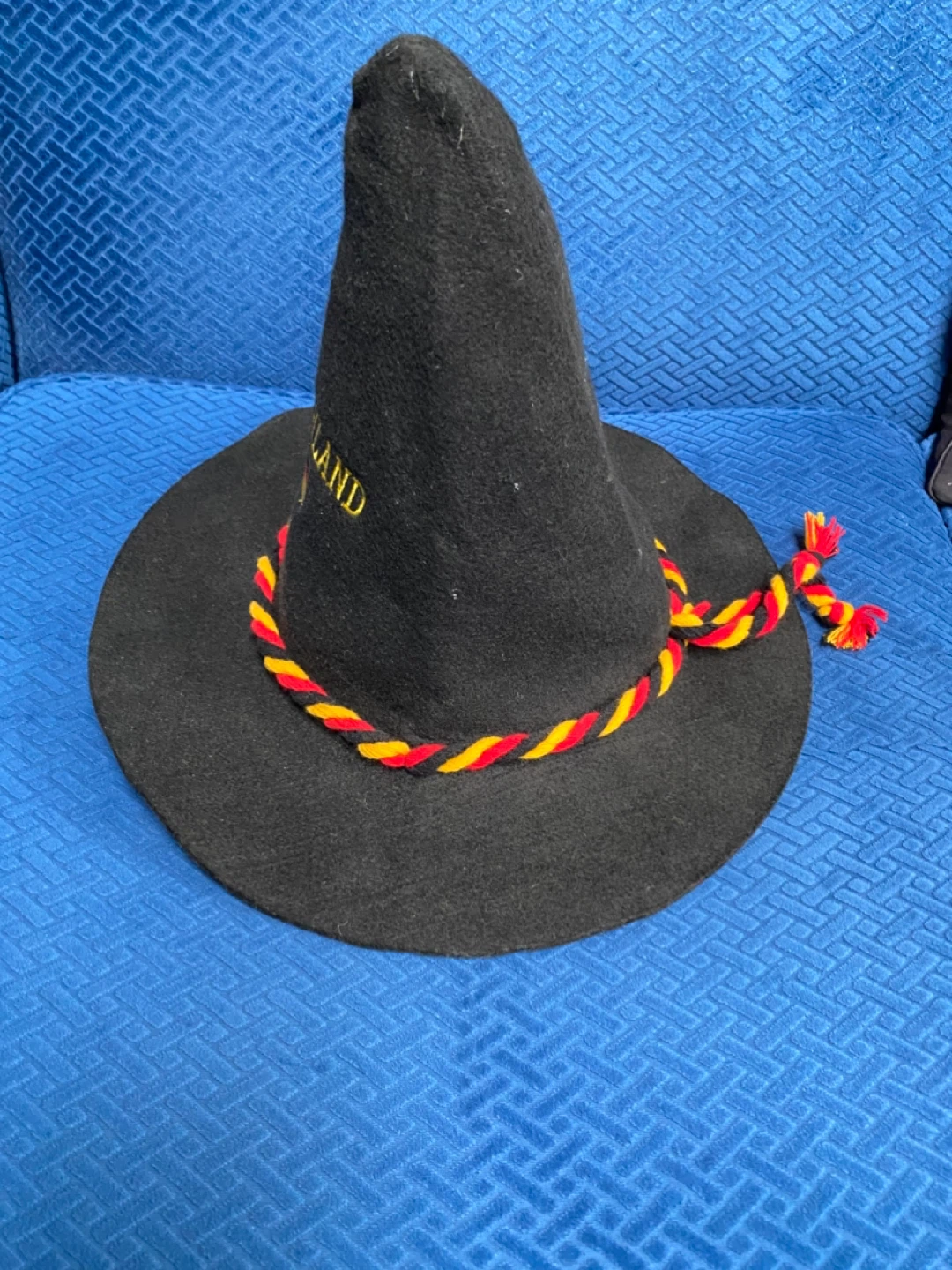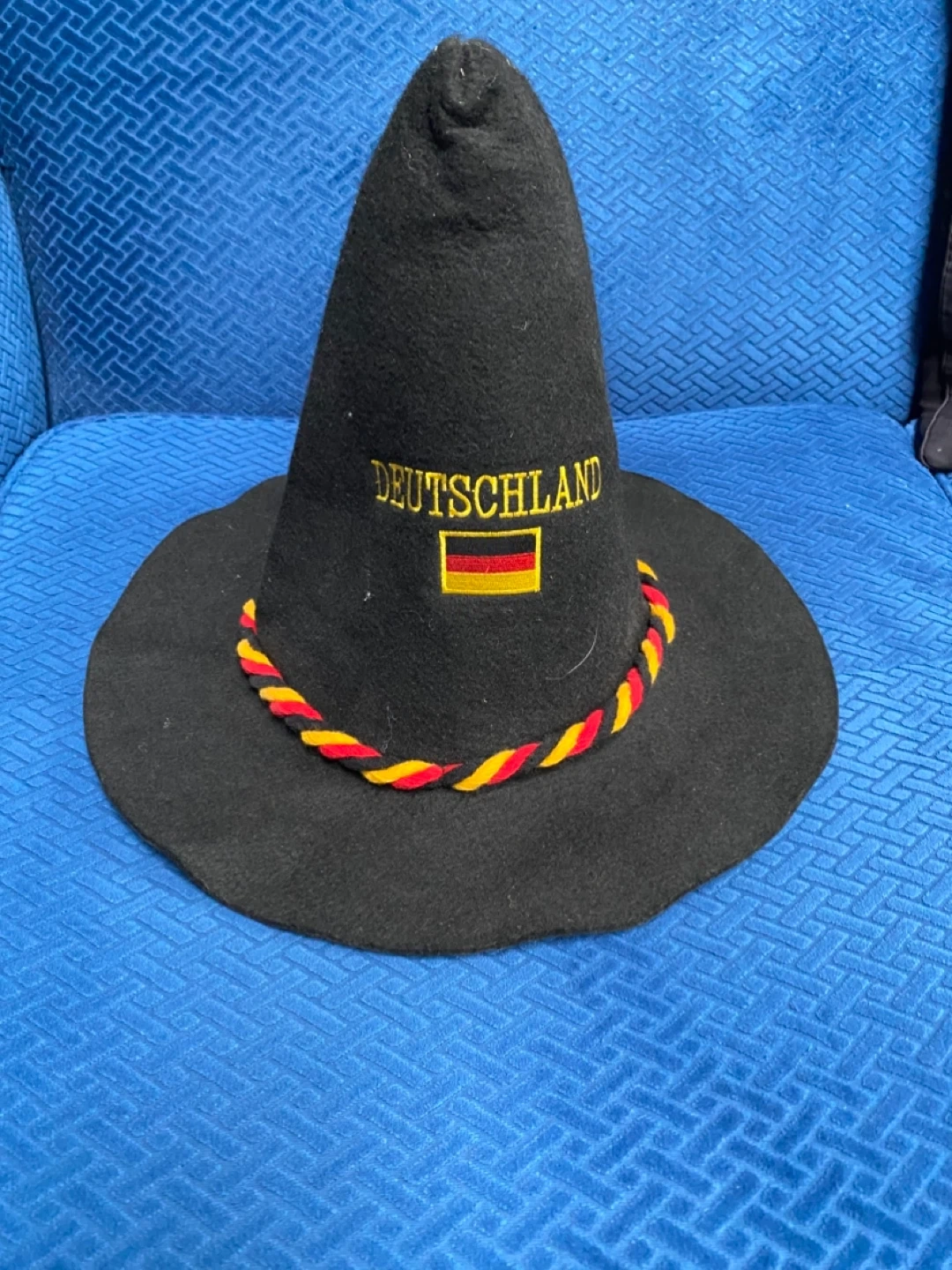 Selling a Deutschland German hat. The hat is black with a rope around the base in the colours of the German flag. The word Deutschland is embroidered on the front.