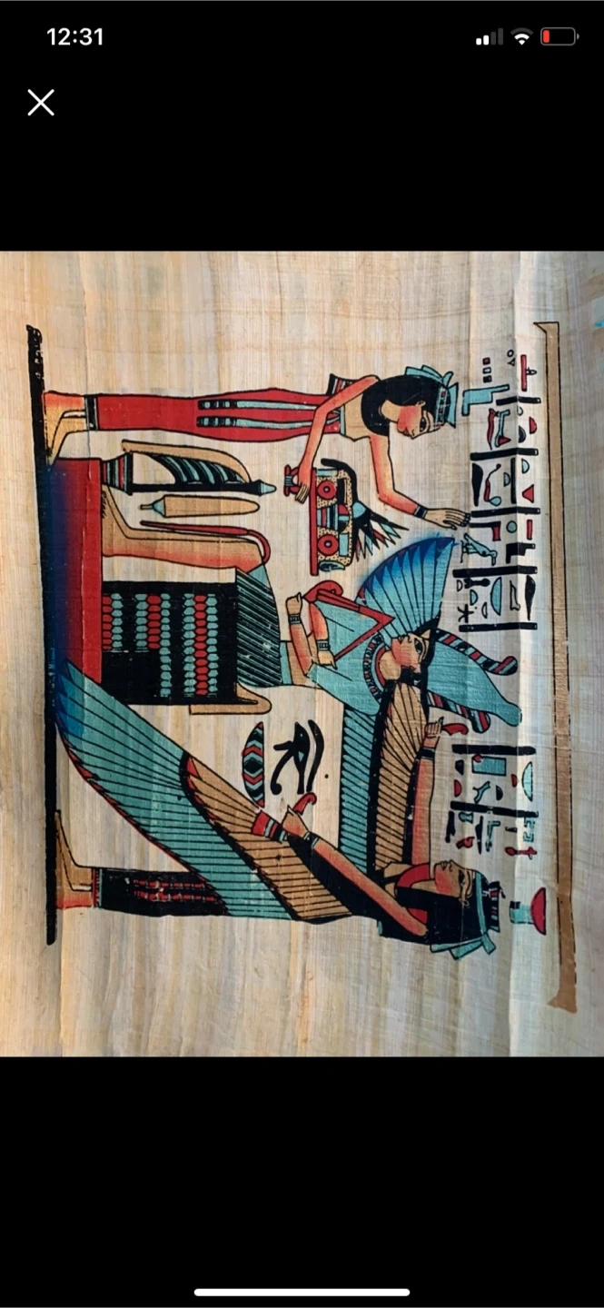 Here's a lovely Egyptian papyrus painting. It depicts figures and hieroglyphs in a traditional style. A great piece for adding some culture to your home!