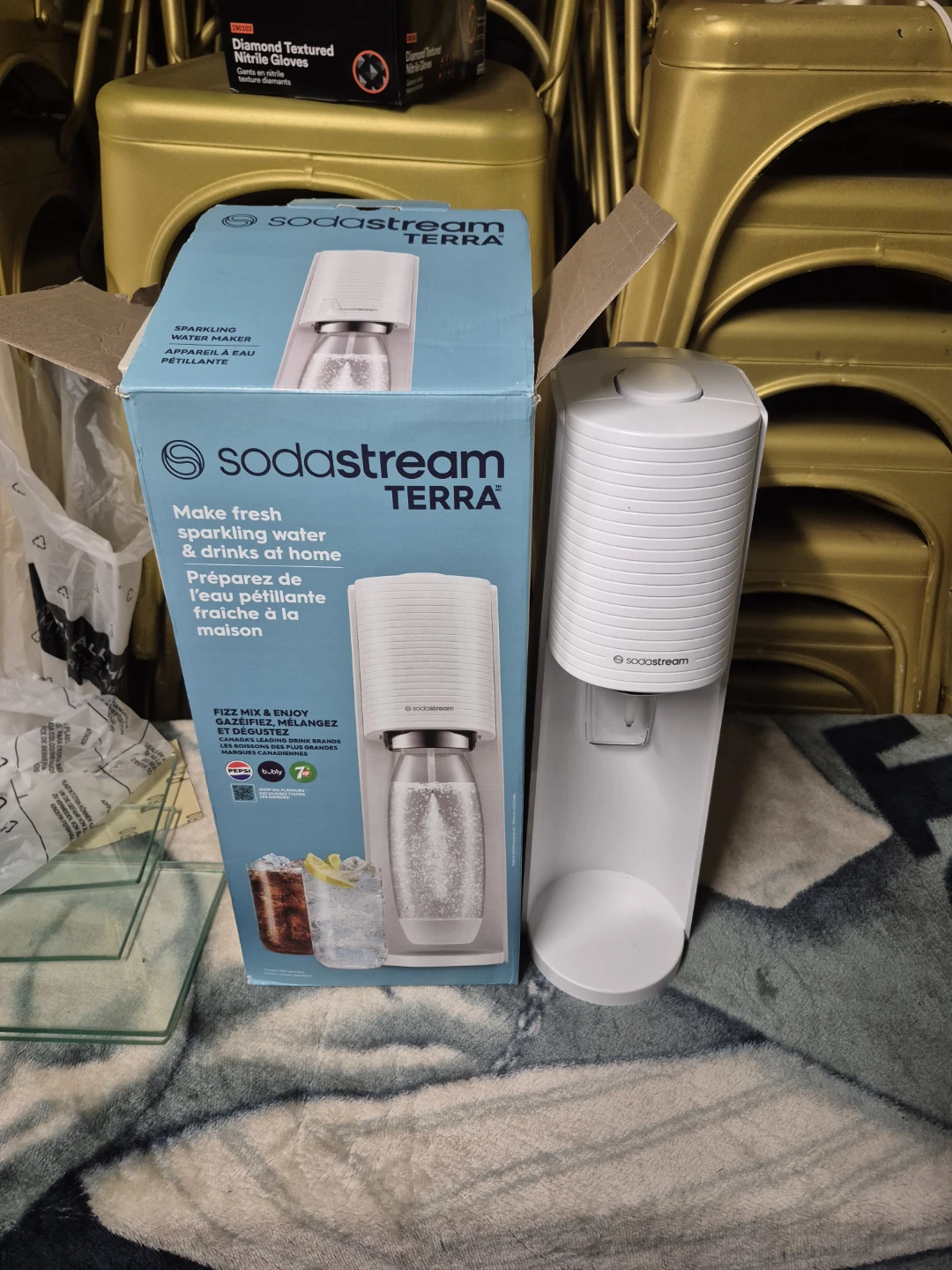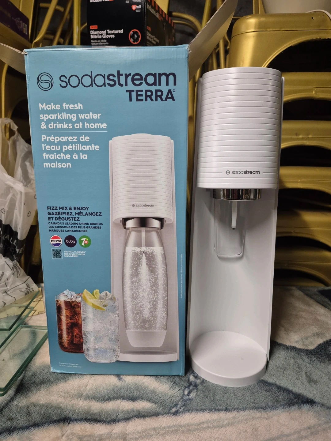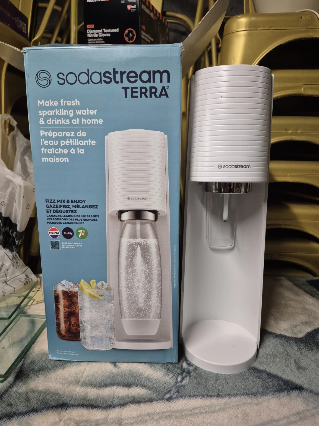 Selling a like new SodaStream Terra sparkling water maker! It's still in its original box and has never been used. Make fresh sparkling water and drinks right at home. A fun way to enjoy your favourite beverages!