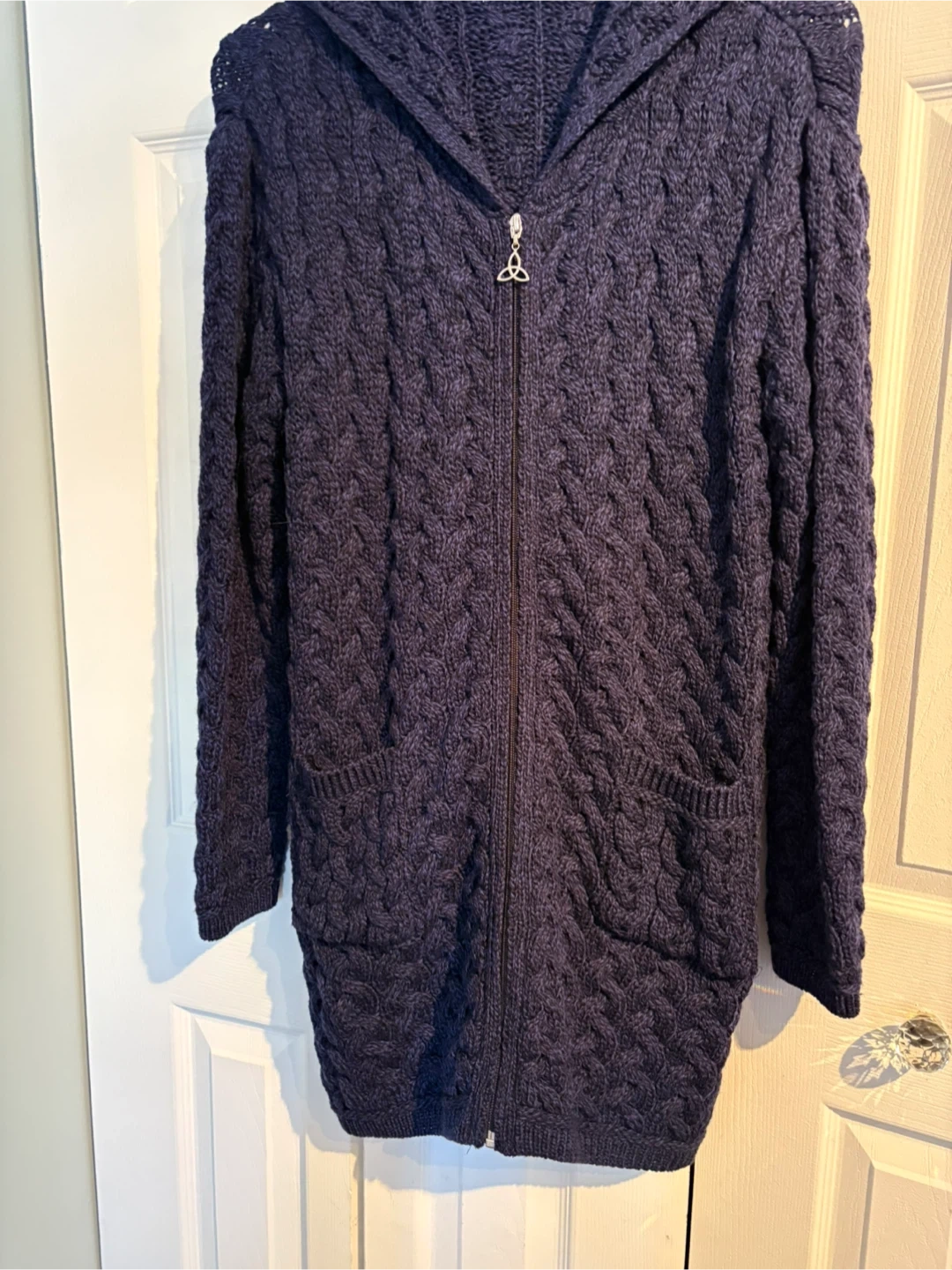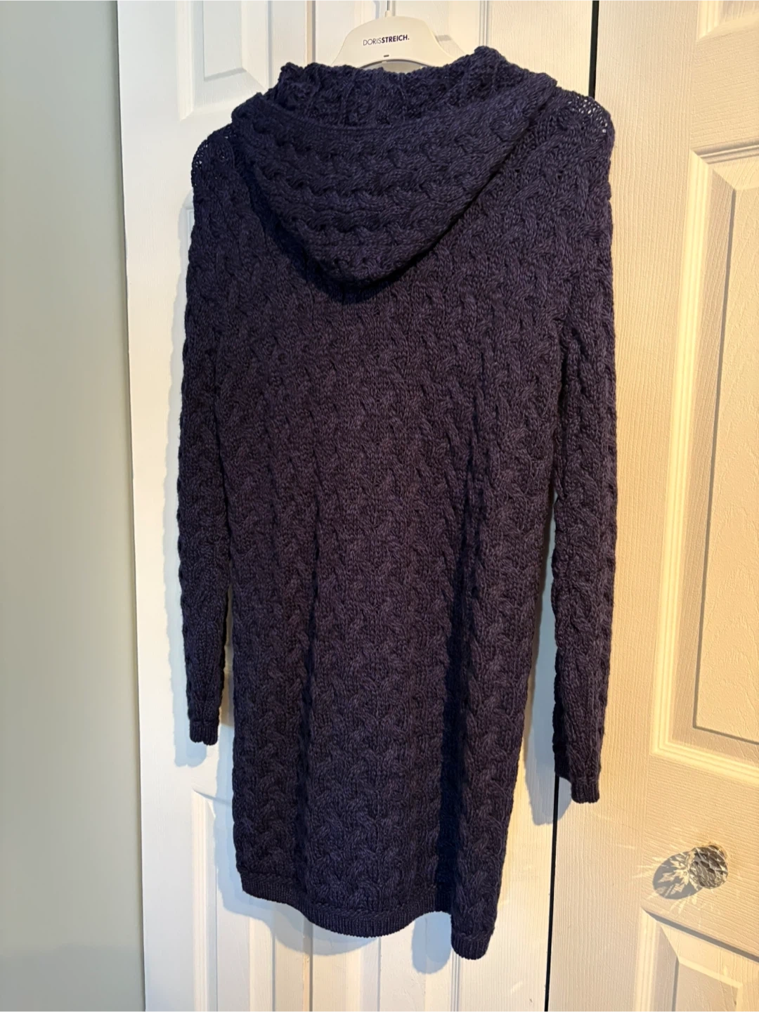 Here's a cozy hooded knit cardigan. It's a beautiful navy colour and in great condition. Perfect for layering or wearing on its own!