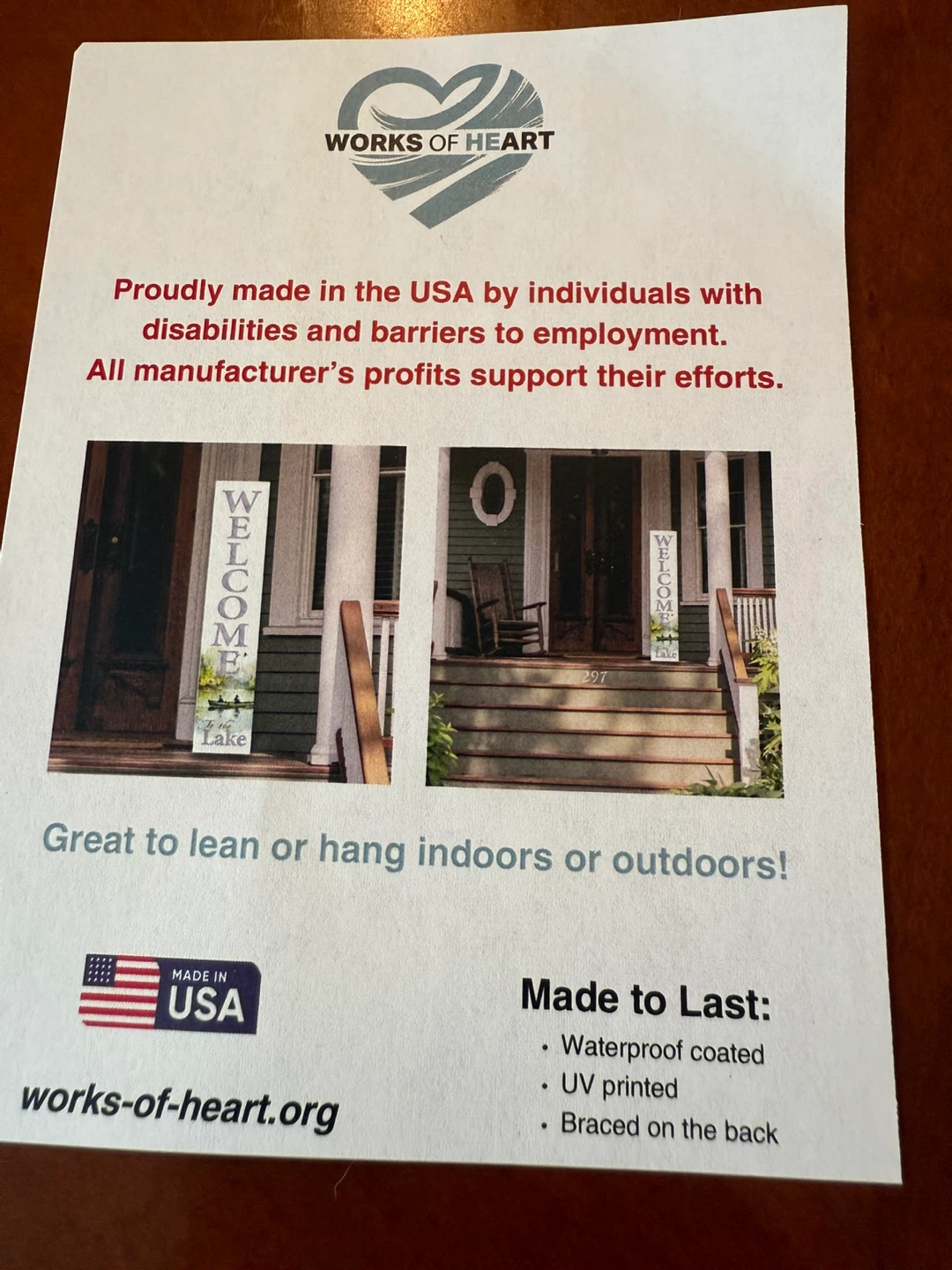 Selling a brand new Works of Heart welcome sign! It's waterproof coated and UV printed, so it's made to last. Great to lean or hang indoors or outdoors. Proudly made in the USA by individuals with disabilities and barriers to employment.