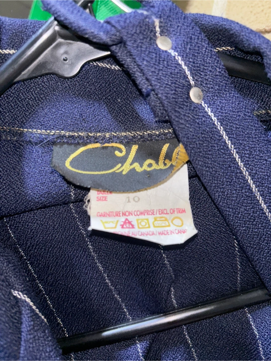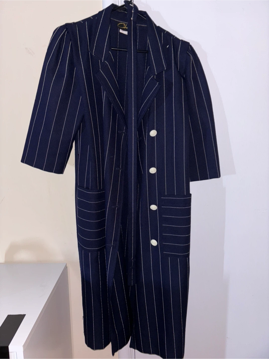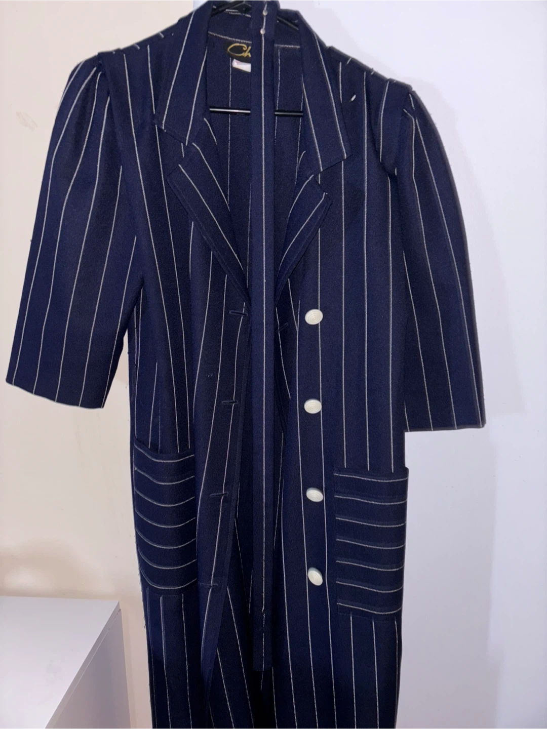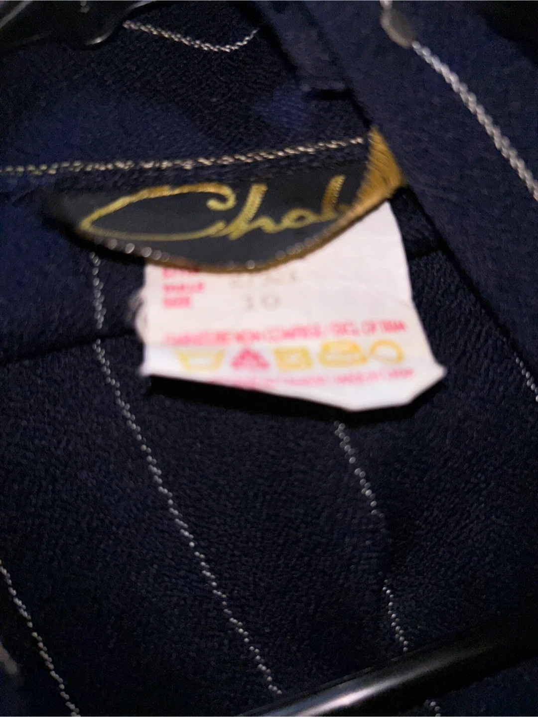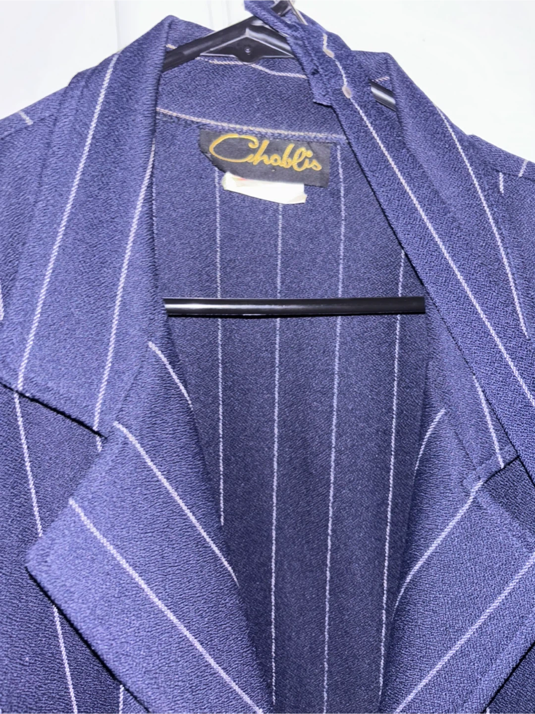 Vintage Chablis blazer in a navy blue with white pinstripes! It's a size 10 and would be a great addition to your wardrobe. The unique design and classic look make it a standout piece.