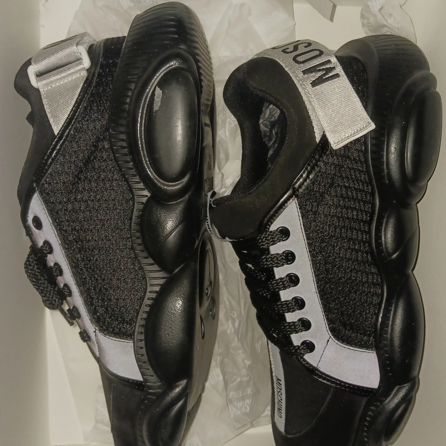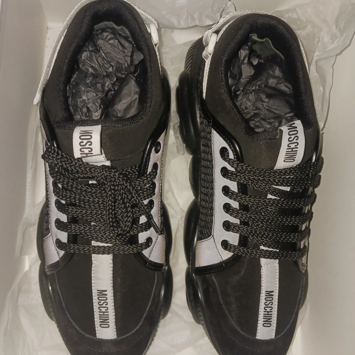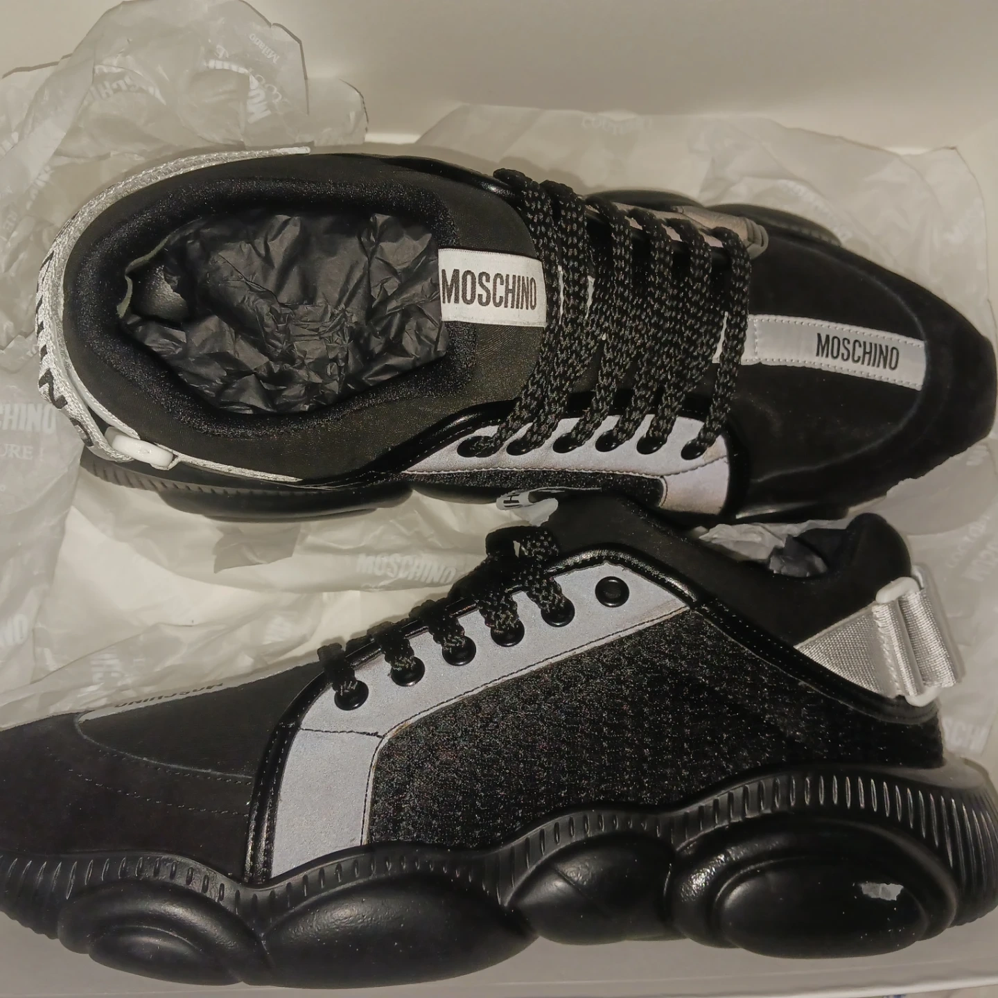 These Moschino Teddy Bubble sneakers are in great condition and come with the original box! They feature a unique bubble sole design and the Moschino logo. Perfect for adding a touch of luxury to your casual outfits