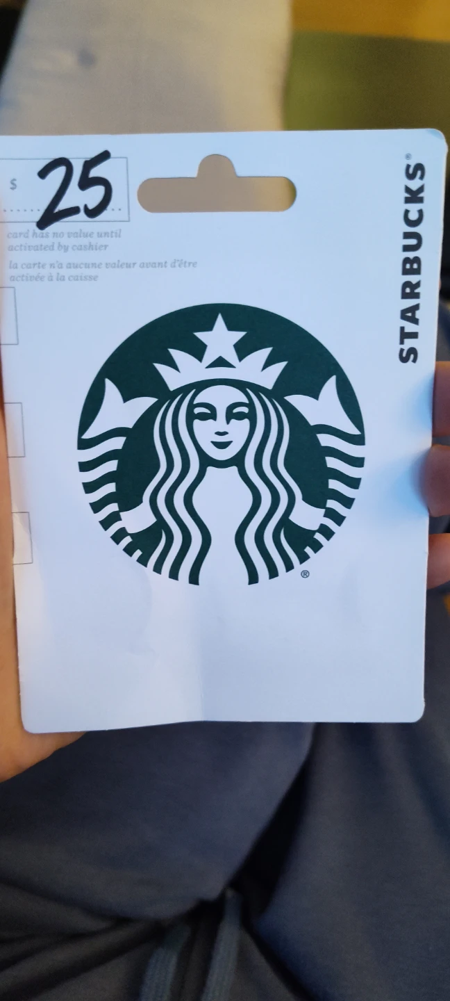 Buy & SellStarbucks $25 GiftcardStarbucks $25 Giftcard$20Selling a Starbucks gift card with a $25 balanceConditionNewWHERE TO MEETYonge and FinchView MapSELLEROliviaFinch1000+221 reviews5 chats·3 favorites·107 viewsSEND CHAT TO SELLERHi Olivia! I’m interested in your listing.Hi Olivia! I’m interested in your listing.Get the Karrot app to chatSign In to chat