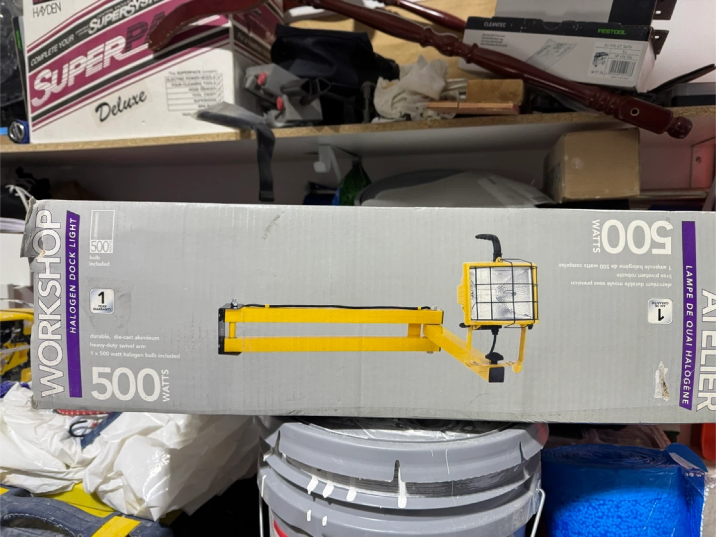 Selling a Workshop Halogen Dock Light, 500 watts. It includes a 500-watt halogen bulb. It features a durable, die-cast aluminum, heavy-duty swivel arm.