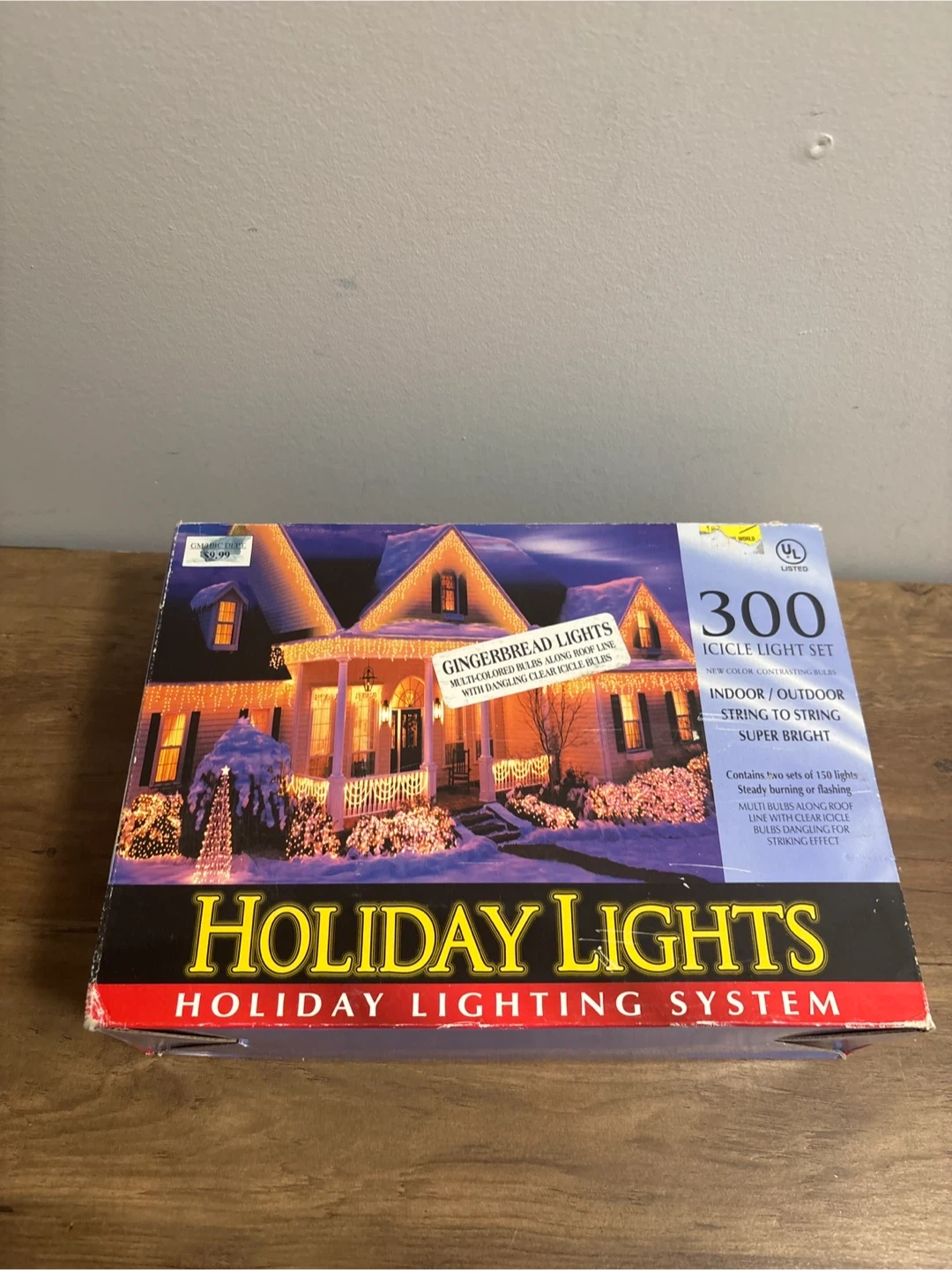 Selling a Holiday Lights 300 Icicle Light Set. It's a holiday lighting system with multi-coloured bulbs along the roof line with dancing clear icicle lights. It's super bright and can be used indoors or outdoors! Contains two sets of 150 lights.