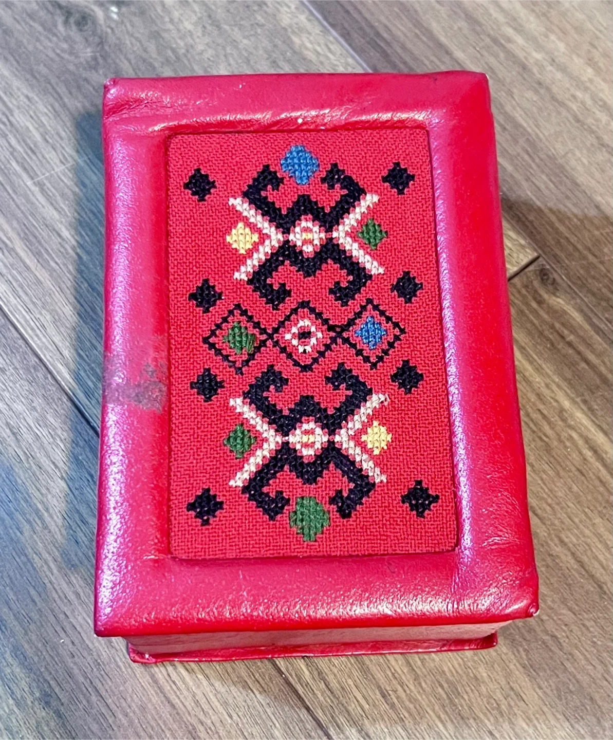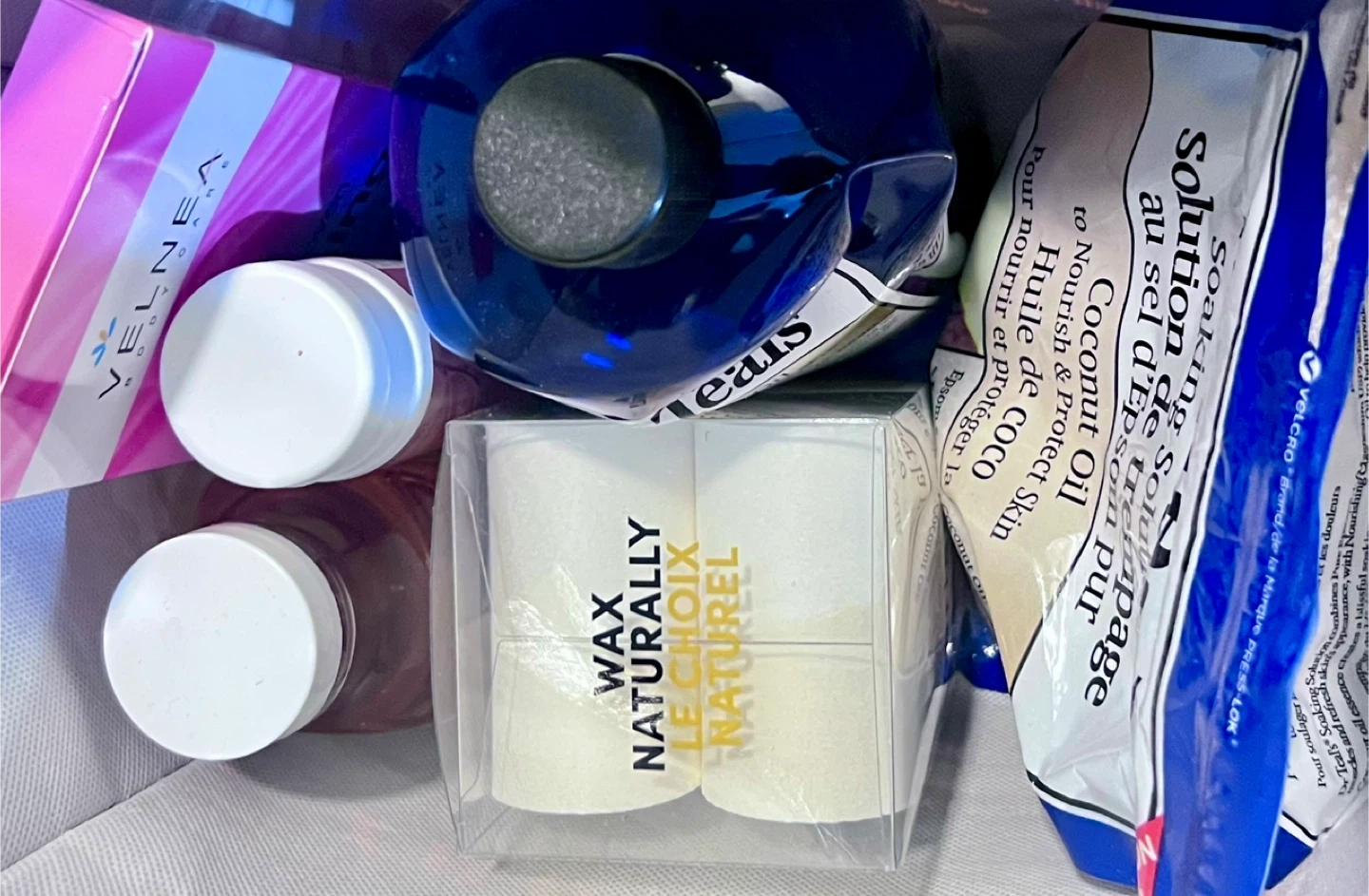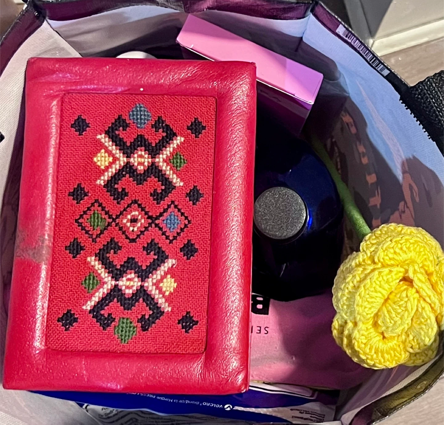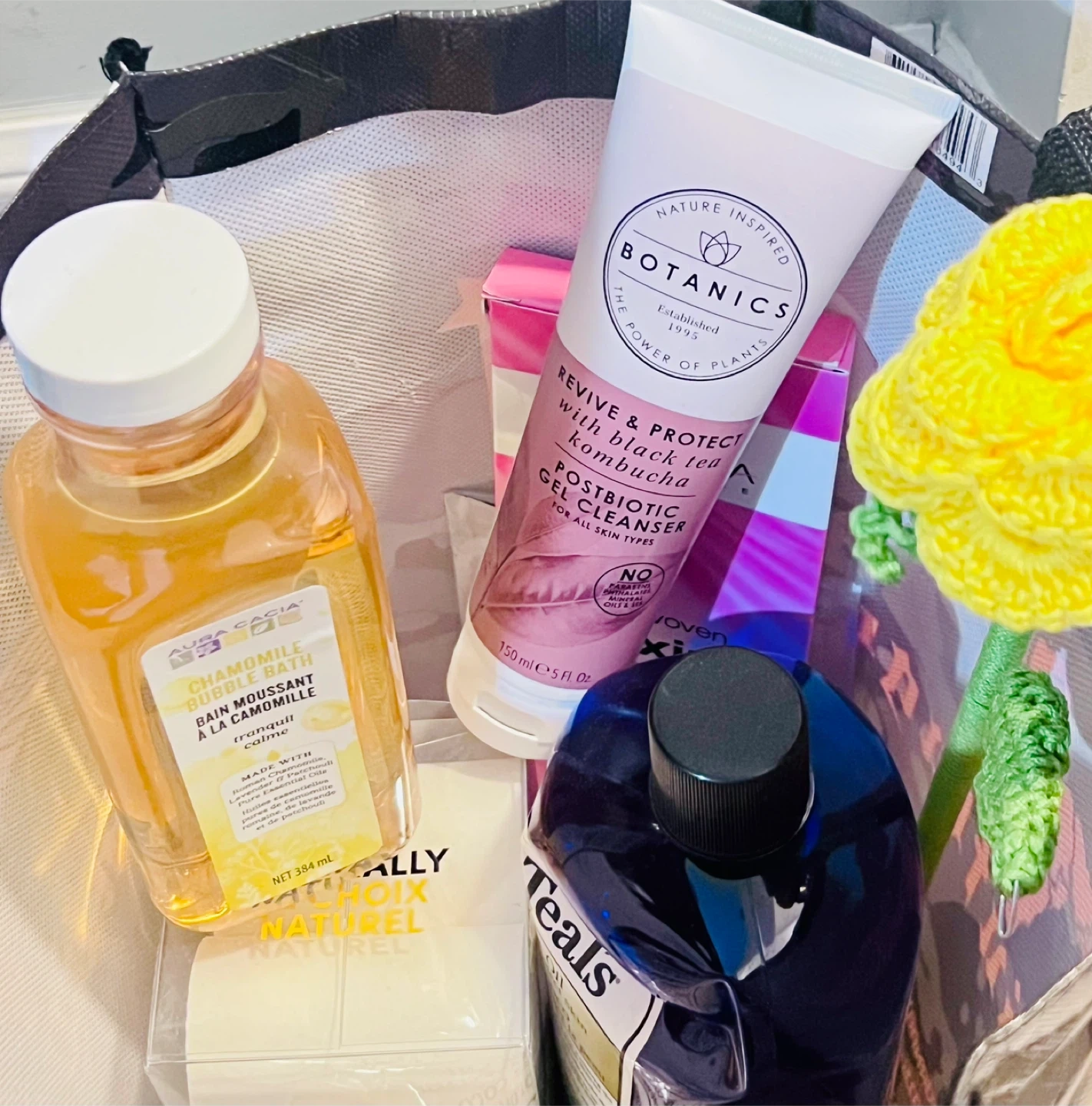 Mixed bag including a vintage red box with embroidered details, an abalone shell, a crocheted yellow flower from Mexico, Botanics gel cleanser (not used but seal removed, wax strips (new), half full Dr. Teal’s epsom salts and bubble bath, new chamomile bubble bath, and more.