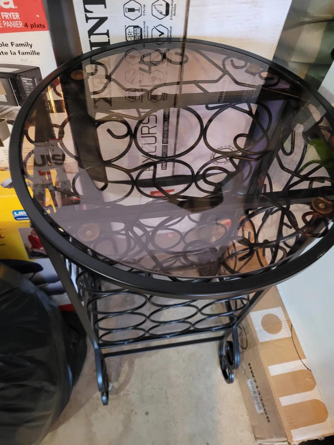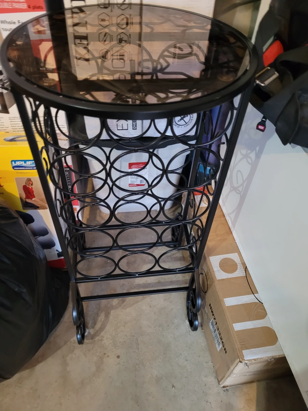 33 inches high. 16 inches across. 15 bottle storage This is a stylish wine rack with a glass top, perfect for storing your favorite bottles and displaying them in your living room or dining area. It has a black metal frame with circular accents and small wheels for easy moving. The glass top adds a touch of elegance to the piece.