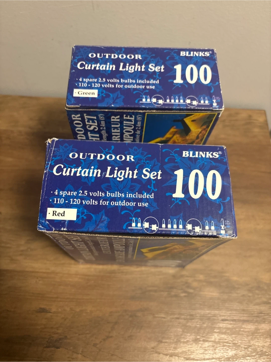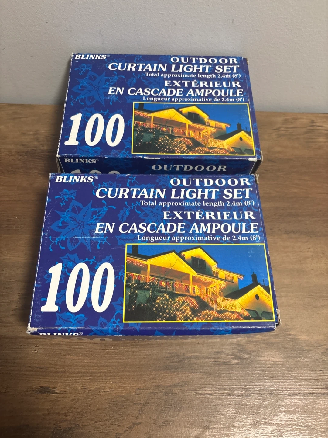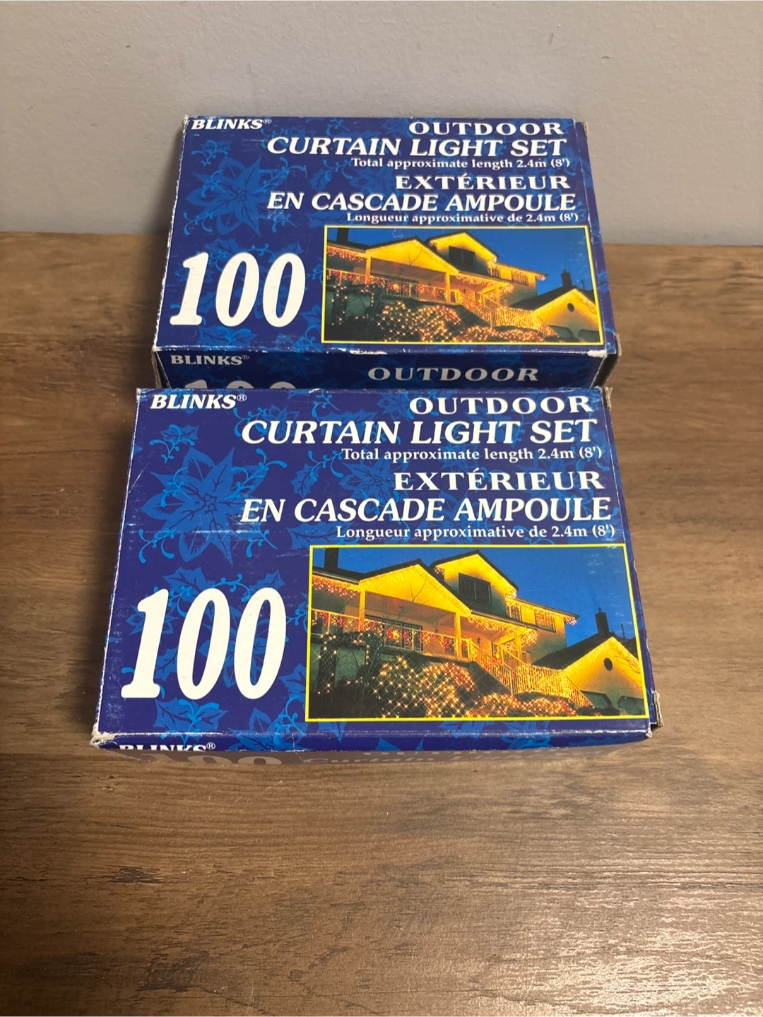I have a Blinks outdoor curtain light set for sale! It has a total approximate length of 2.4m (8'). It also includes 4 spare 2.5 volts bulbs and is 110-120 volts for outdoor use