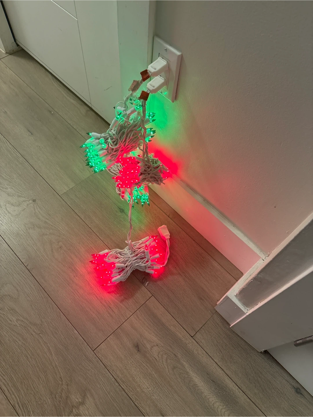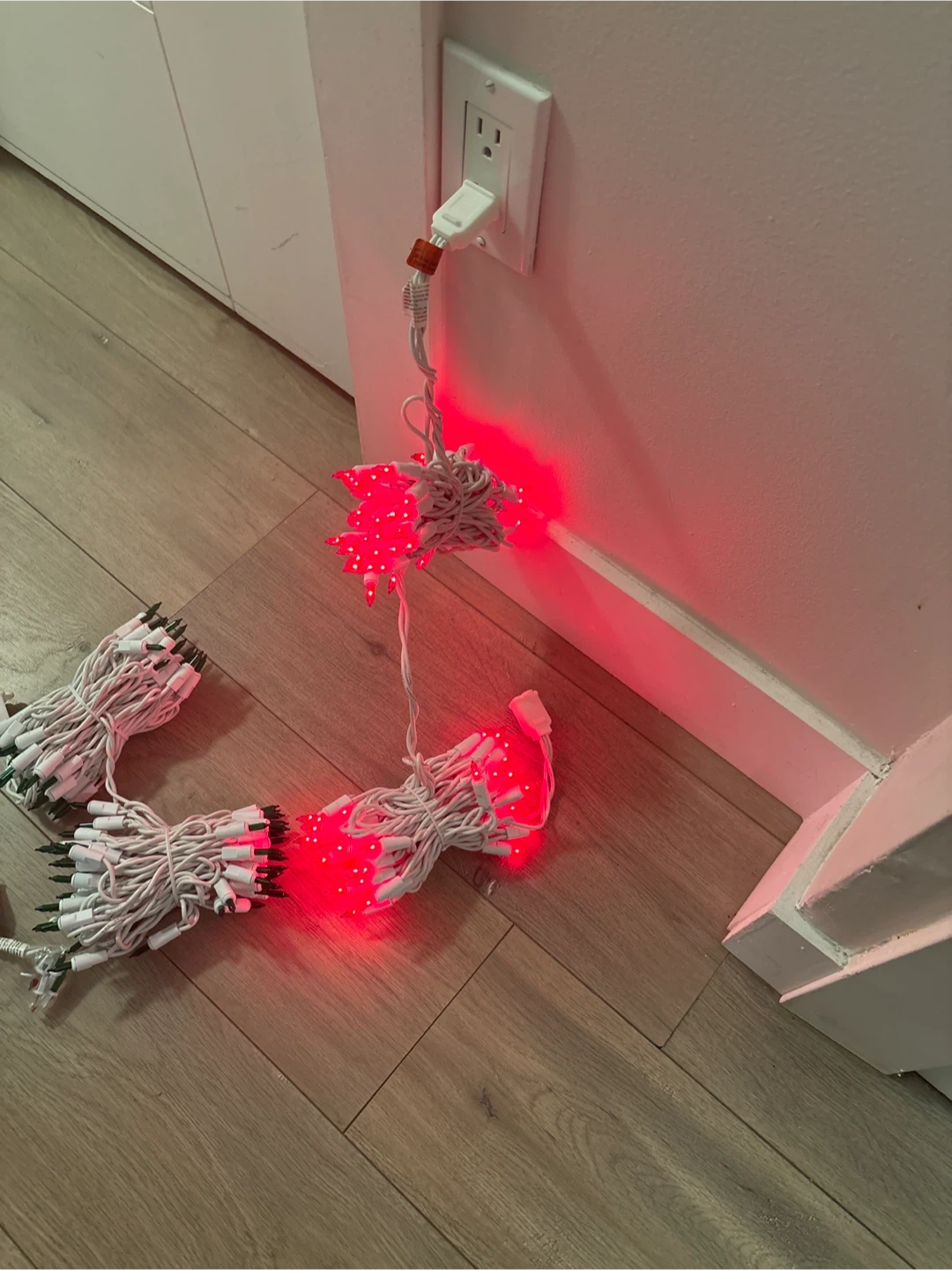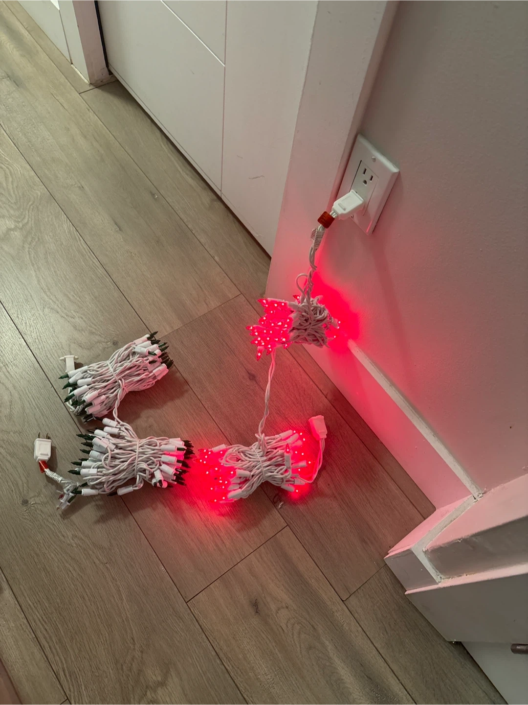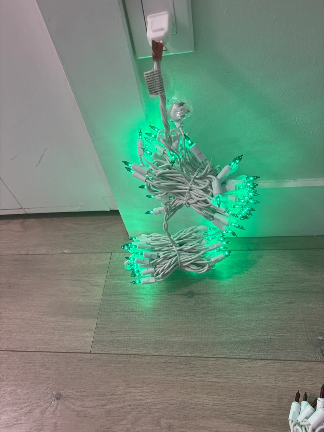 I have a Blinks outdoor curtain light set for sale! It has a total approximate length of 2.4m (8'). It also includes 4 spare 2.5 volts bulbs and is 110-120 volts for outdoor use