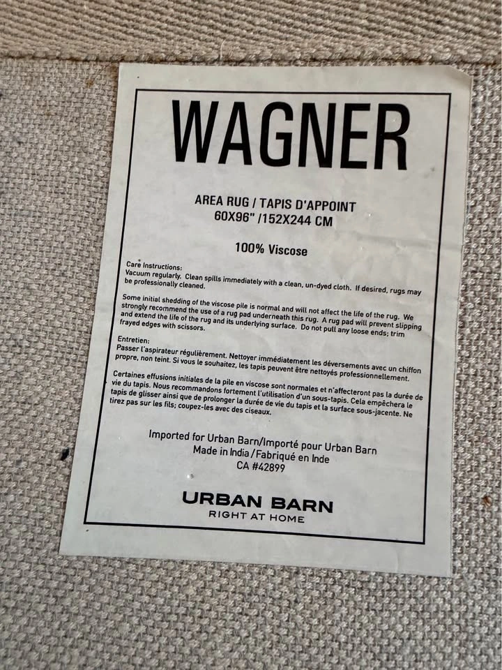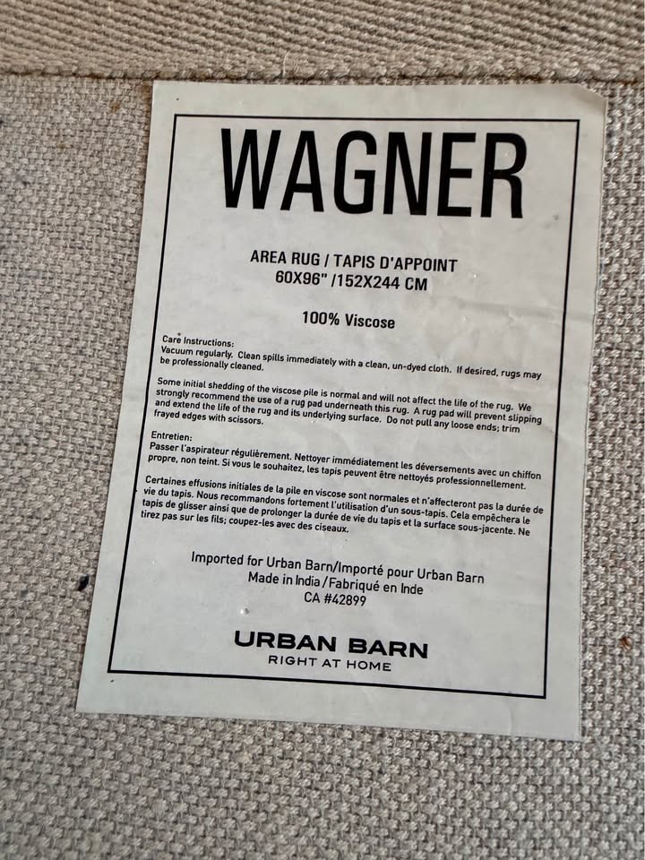Urban Barn Wagner area rug in a medium blue tone, size 5’ x 8’ (60” x 96”). Made from 100% viscose. Soft underfoot with a subtle tonal, textured look that changes slightly depending on light and pile direction (typical of viscose rugs).