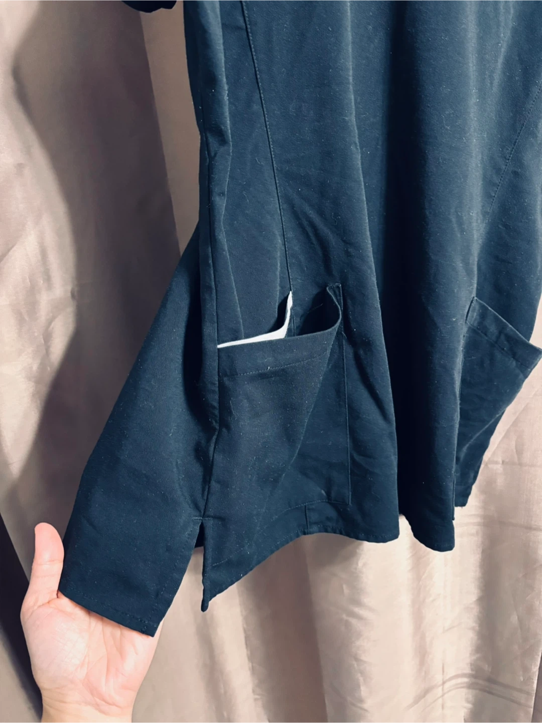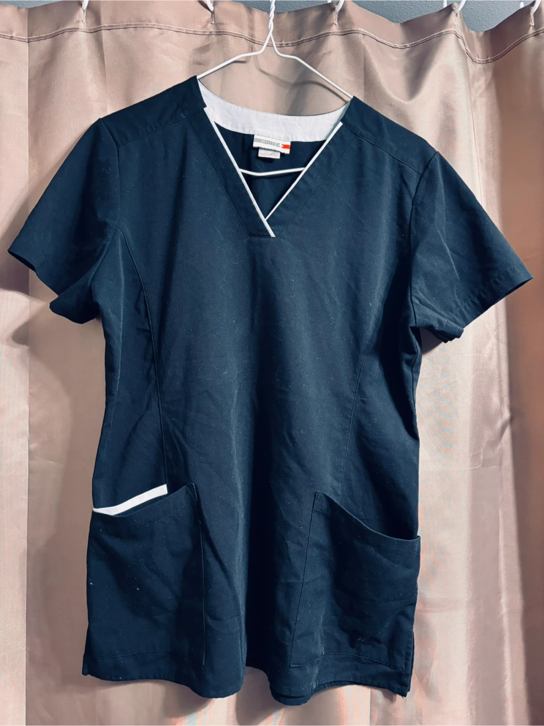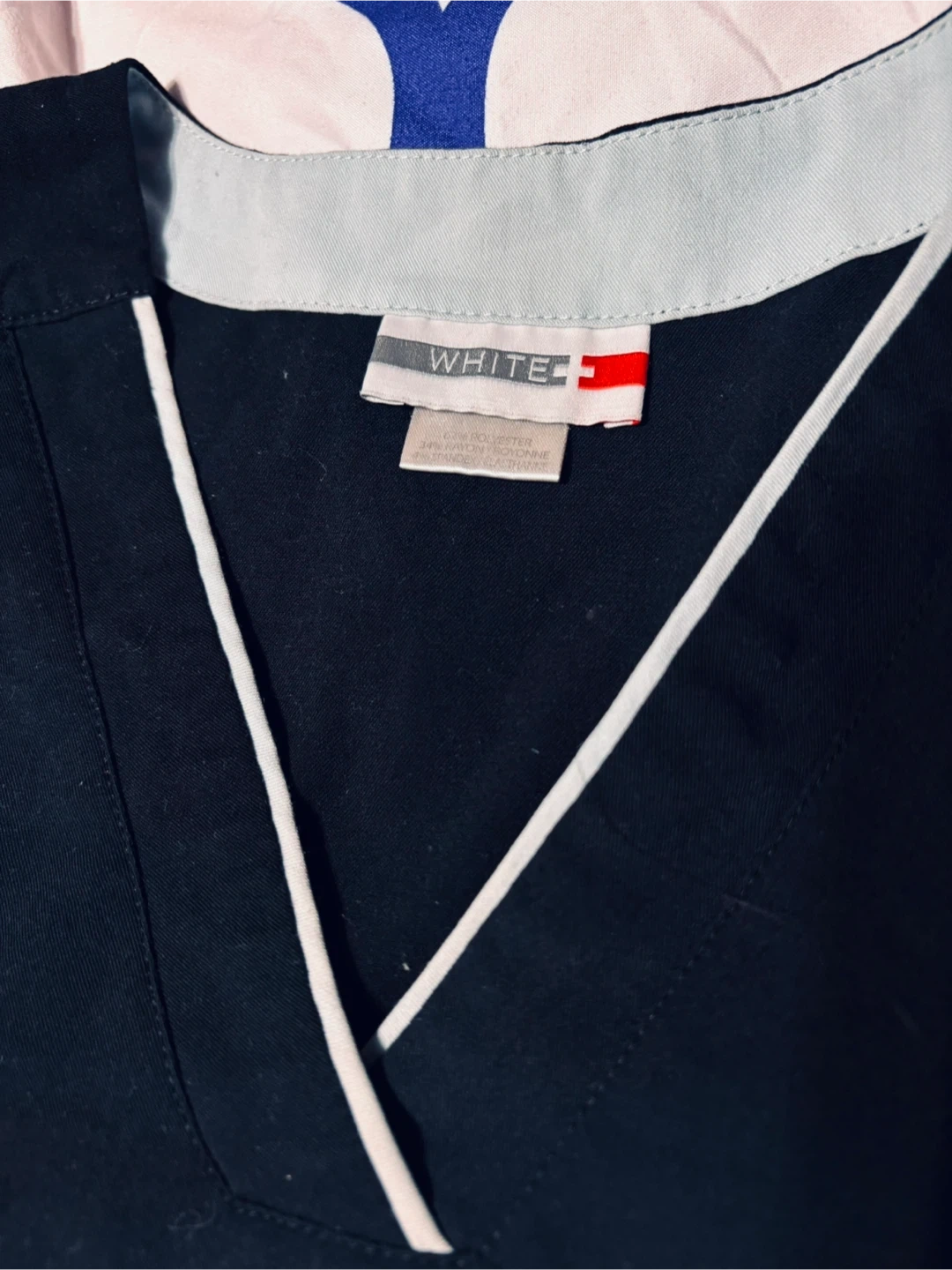 White Cross scrub top in black. Size: Small. It's made of 62% polyester, 34% rayon, and 4% spandex.