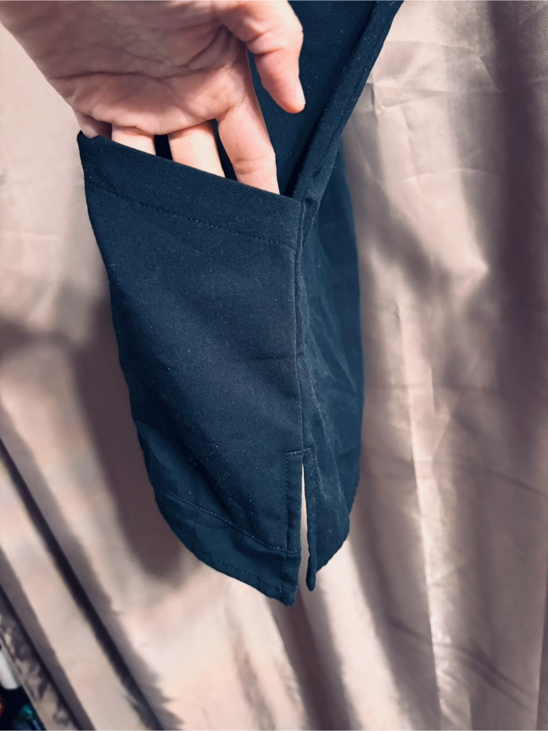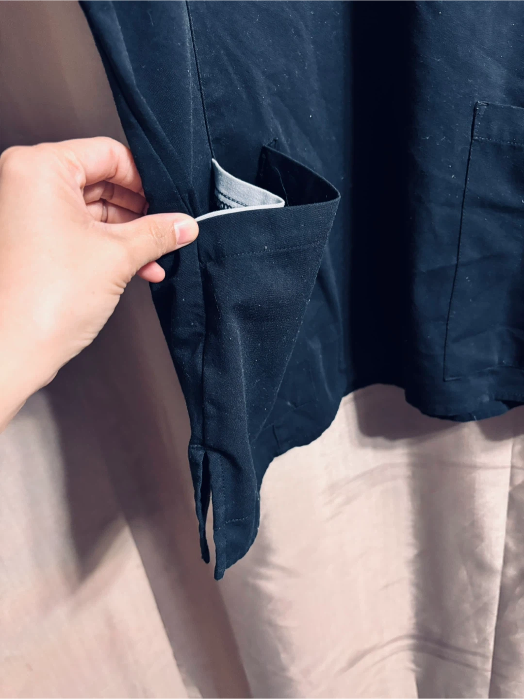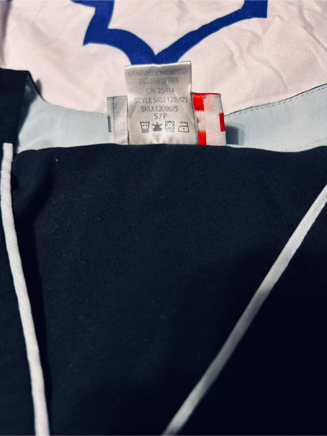White Cross scrub top in black. Size: Small. It's made of 62% polyester, 34% rayon, and 4% spandex.