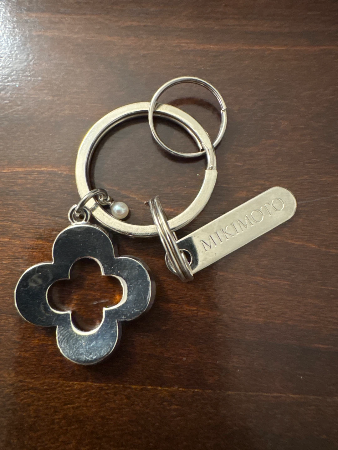 Selling a Mikimoto keyring. It features a silver-tone clover charm and the Mikimoto nameplate. A great accessory for your keys or bag!
