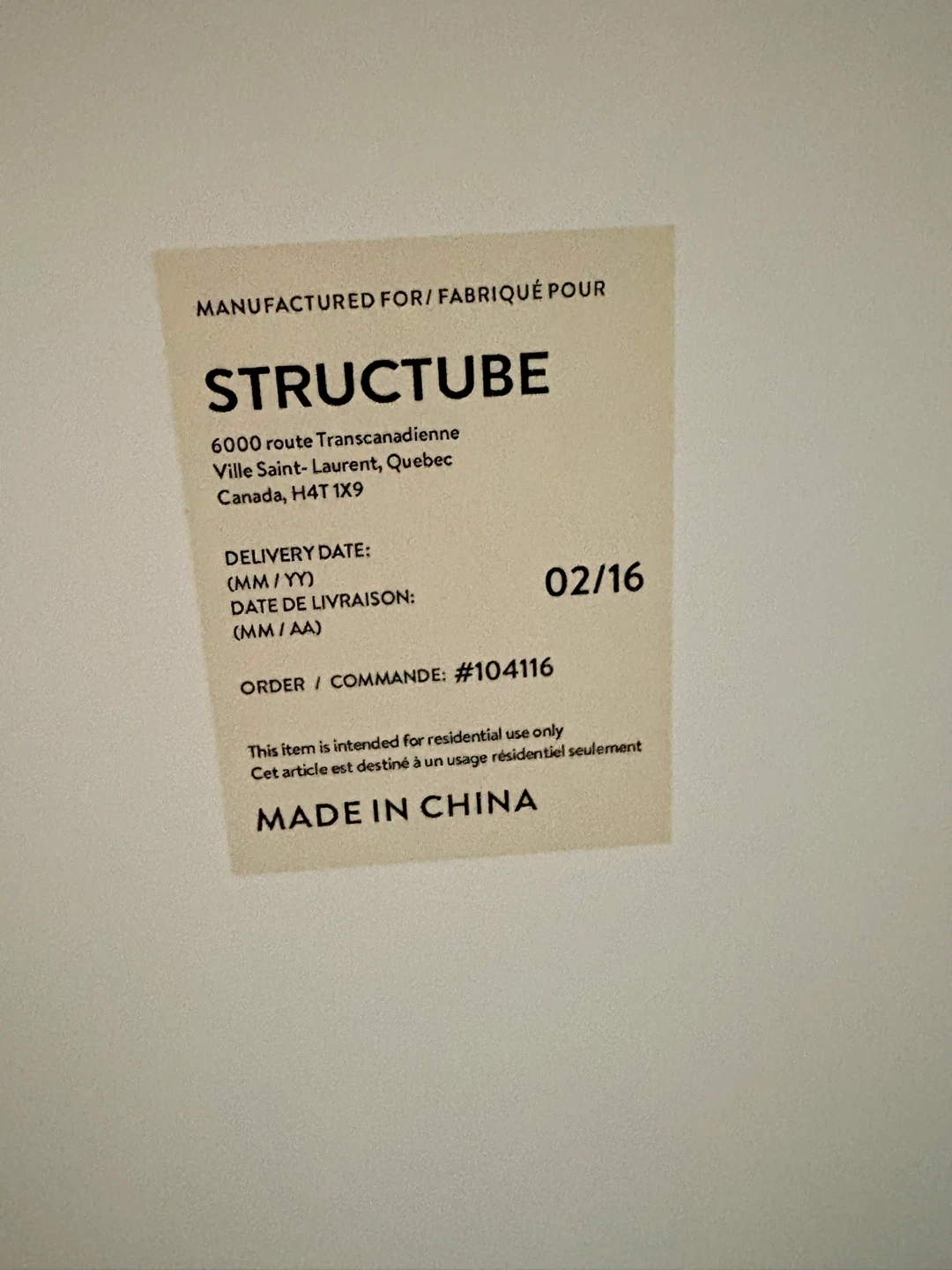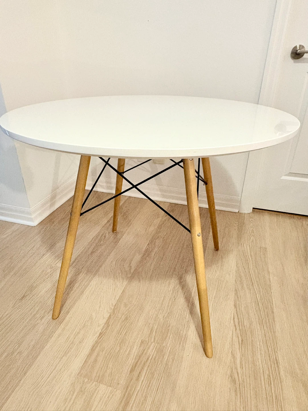 Selling a Structube dining table in great condition! The table features a white top and wooden legs with black metal supports.