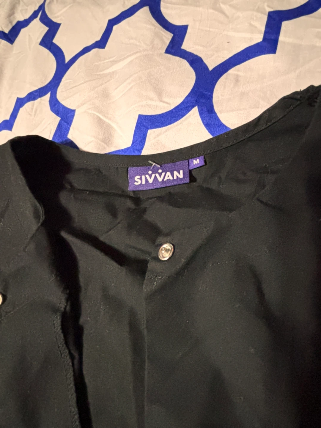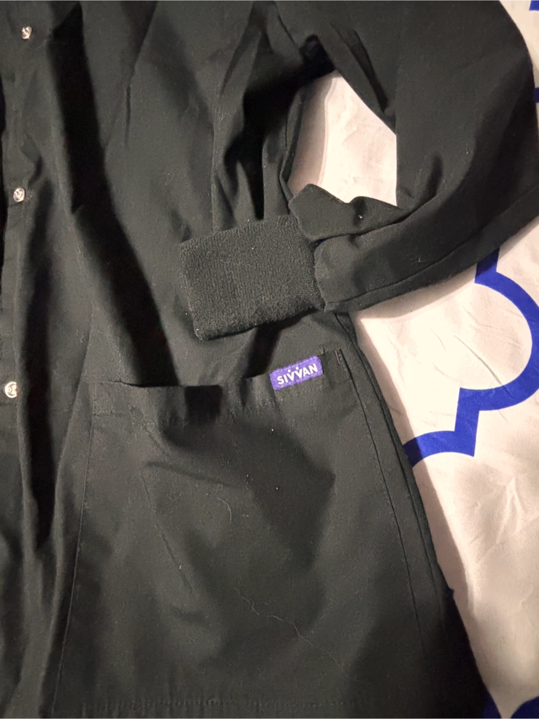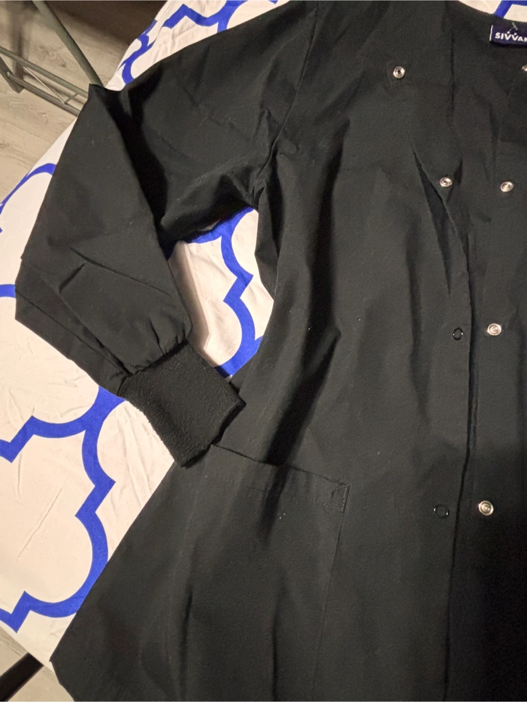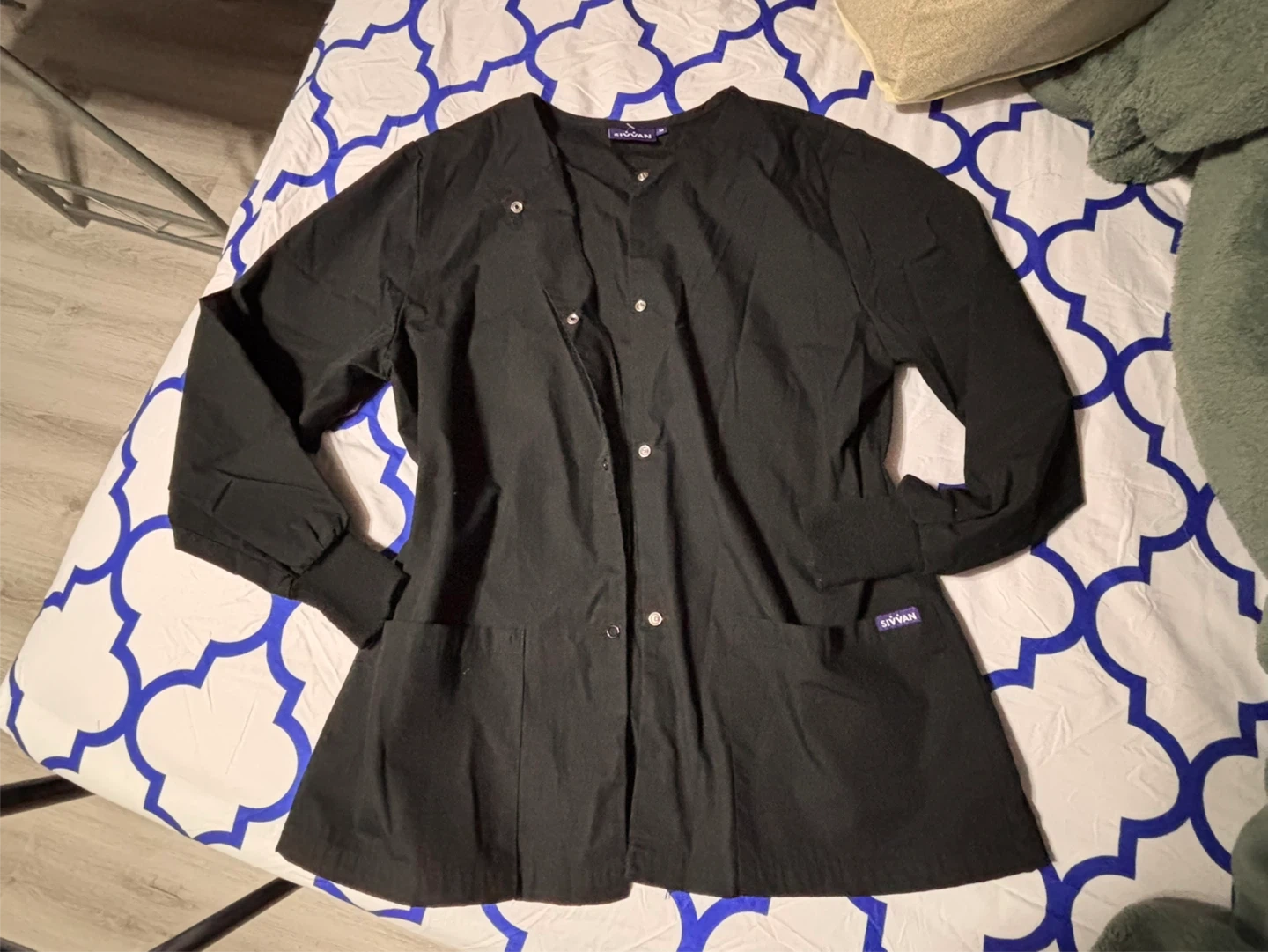 Sivvan scrub jacket in black, size medium. It's in great condition and ready for a new owner! Perfect for healthcare professionals or anyone needing a durable and comfortable jacket.