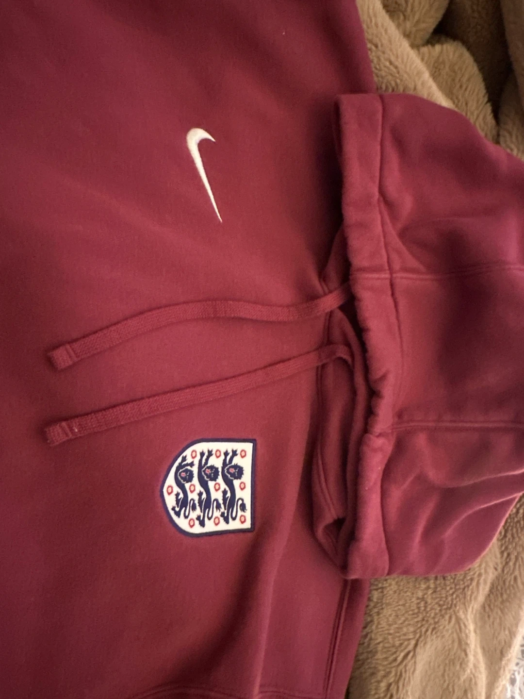 Selling a Nike hoodie featuring the England emblem! It's a size medium and in great condition. The colour is a nice burgundy. Perfect for showing your support or just staying comfy!