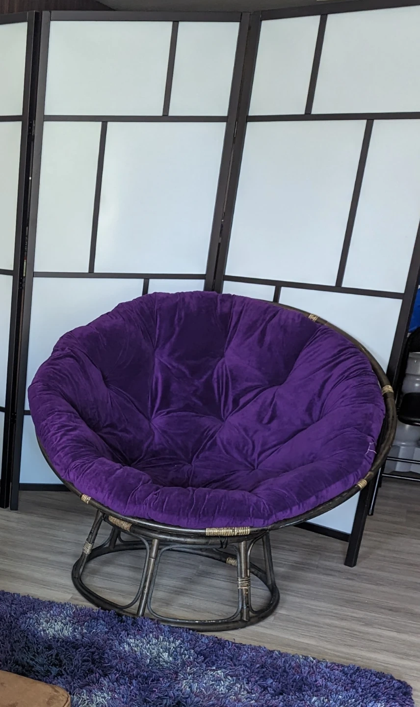 Selling a comfy Papasan chair with a purple cushion. It's in great shape and ready for a new home. Originally bought for $359.99 but now looking to sell for $150