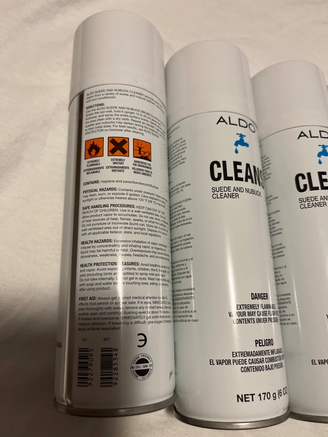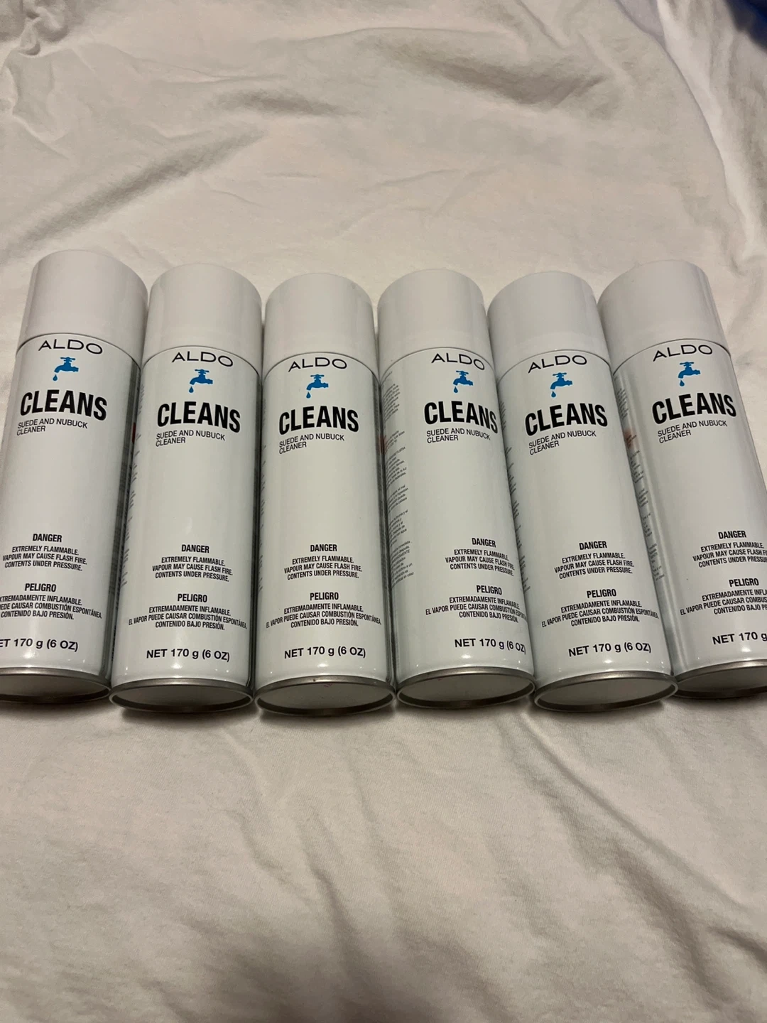 Selling six cans of ALDO Suede and Nubuck Cleaner. They're perfect for keeping your suede and nubuck shoes and accessories looking their best. Each can contains 170g (6 oz) of cleaner. Keep your items looking fresh! $10 each CASH only