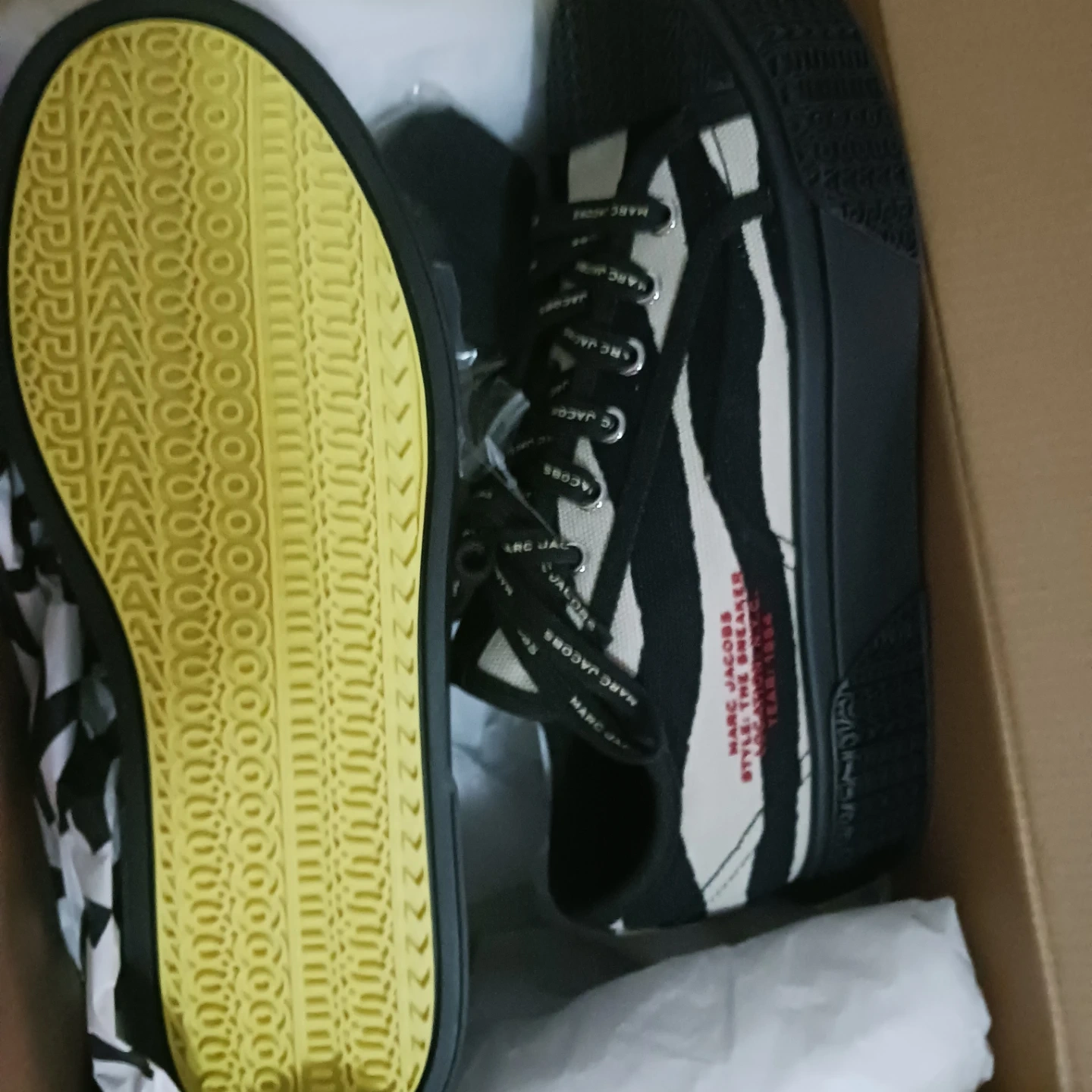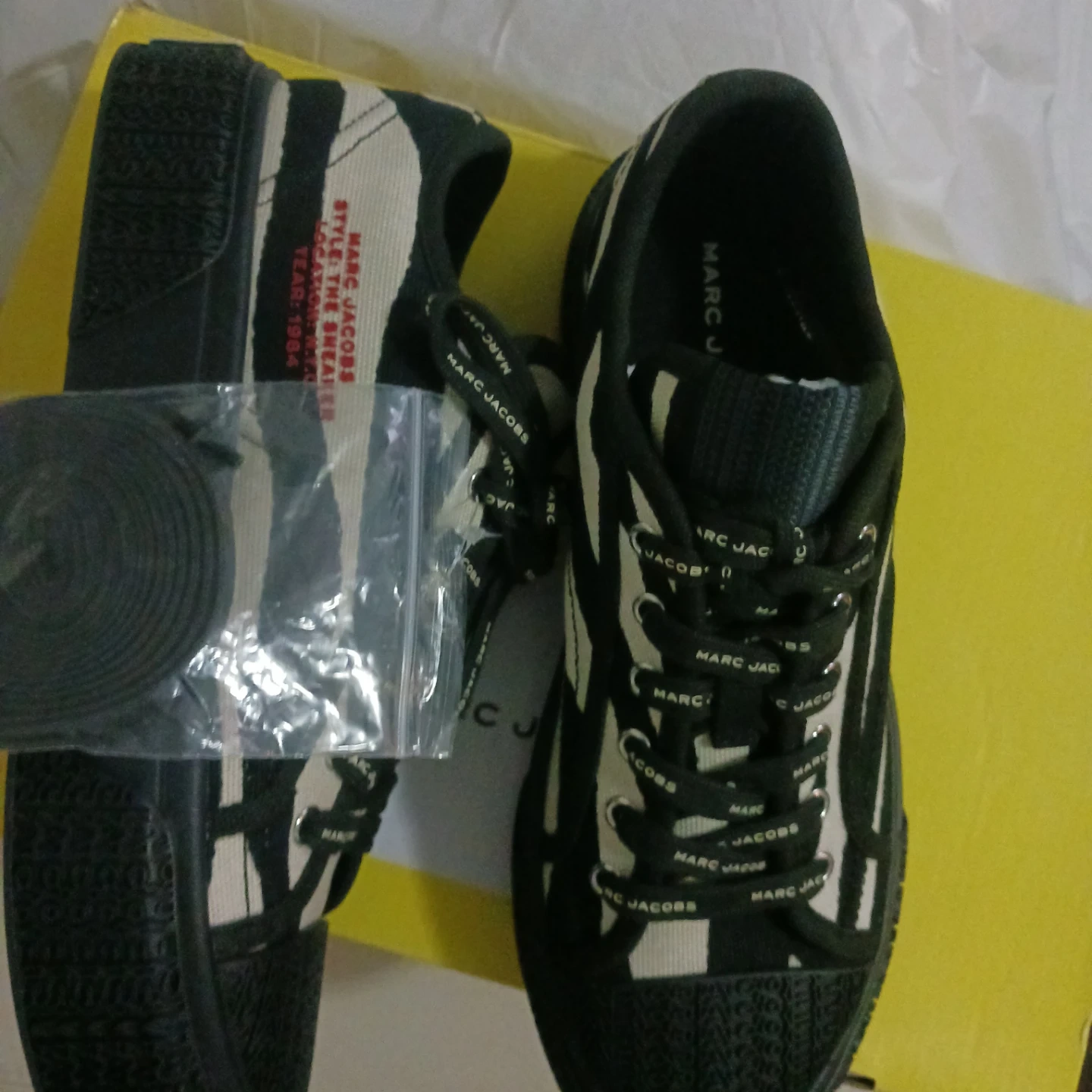 These are a pair of new Marc Jacobs "Style: The Sneaker" shoes. They are black and white and come with the original box