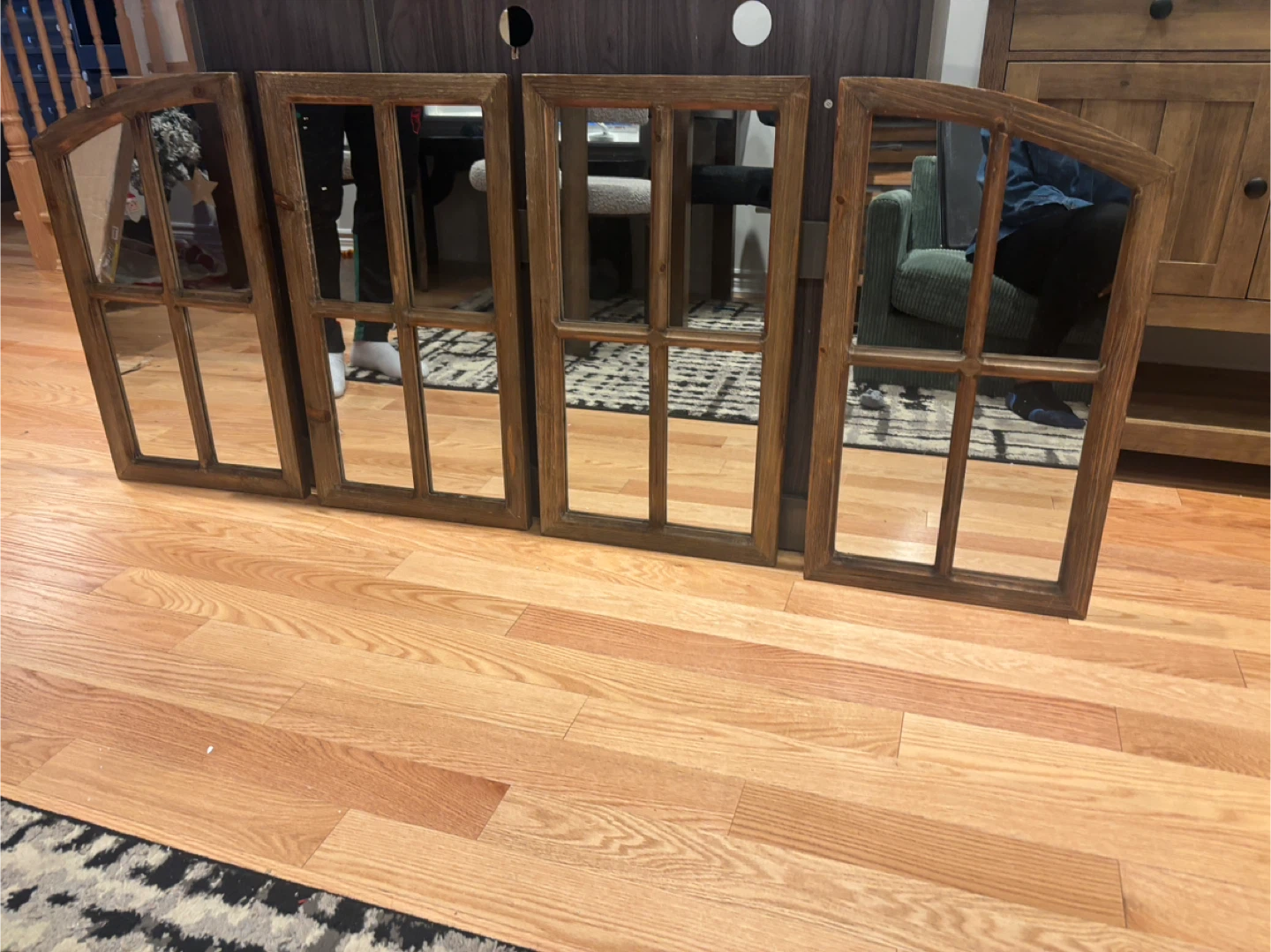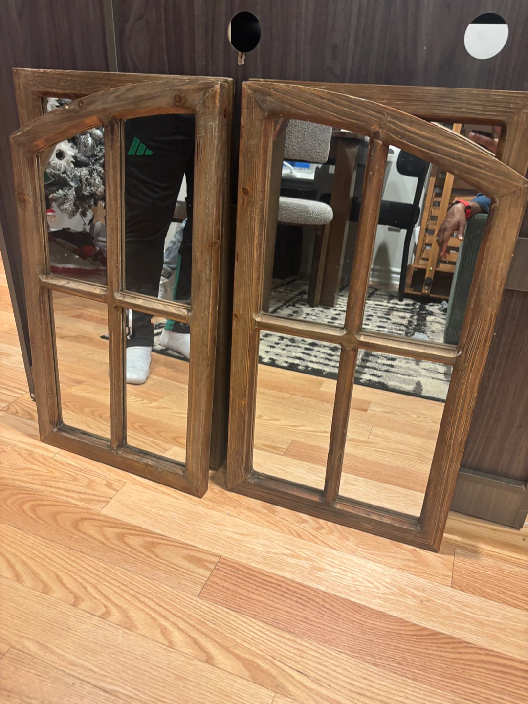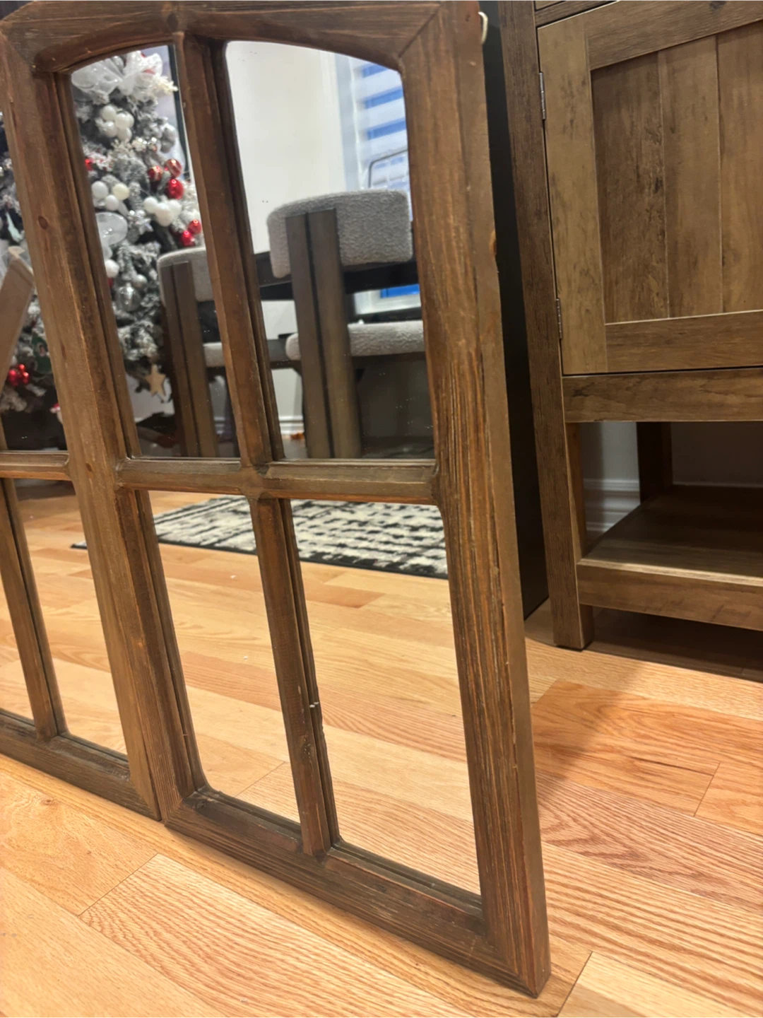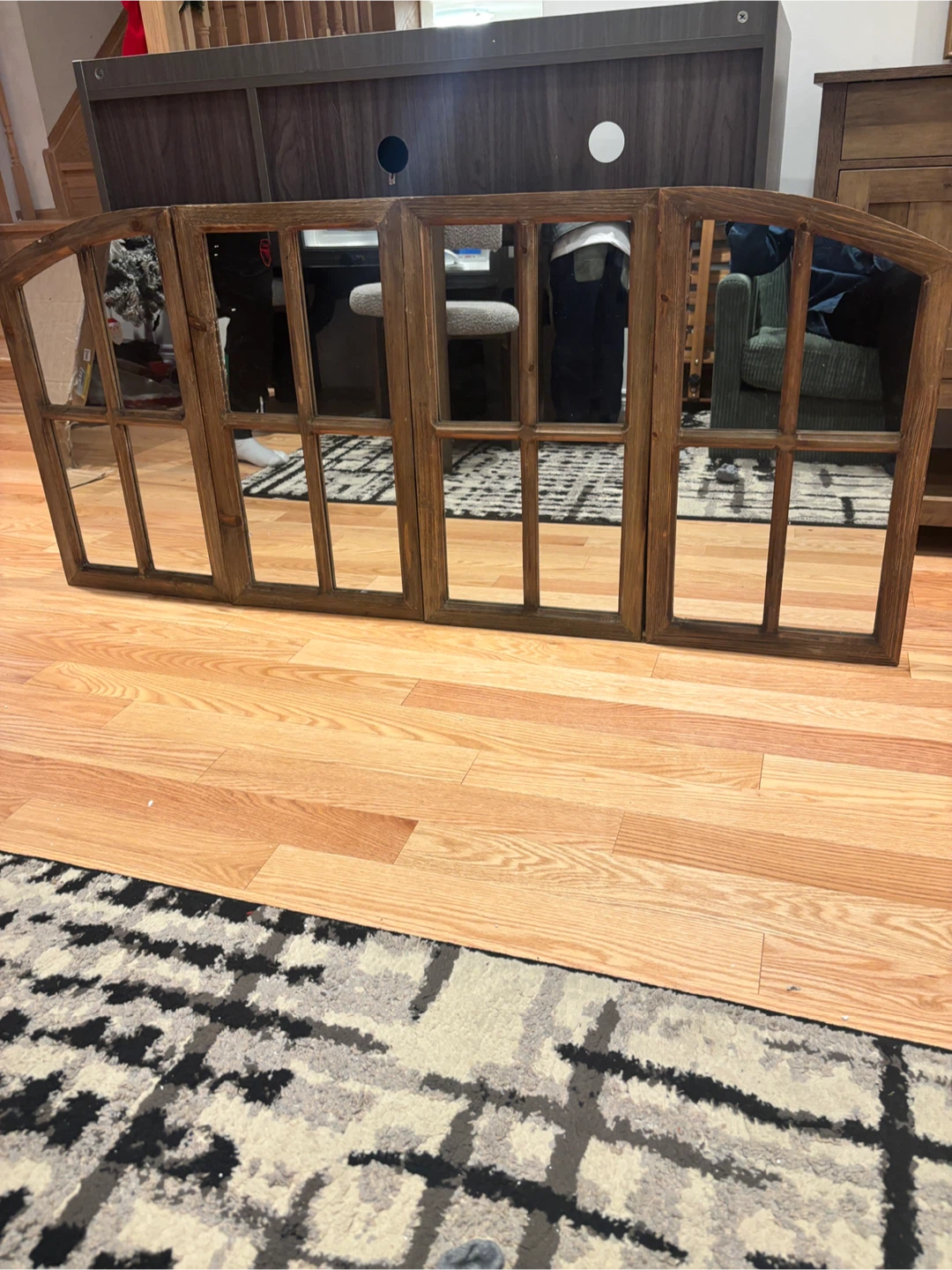 Selling four decorative window mirror panels with a rustic wood frame. Great for adding a unique touch to your home decor!. Available for pickup and delivery.