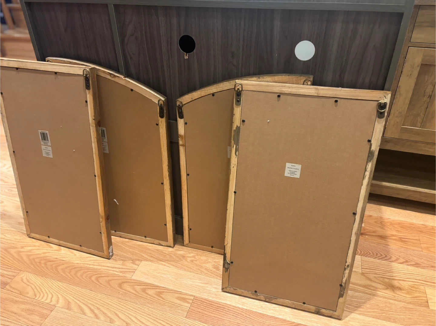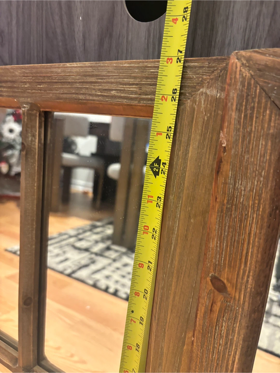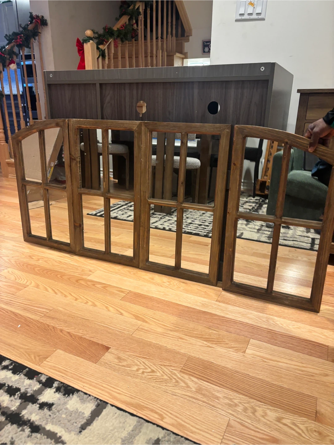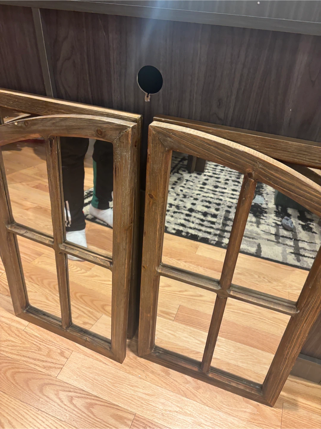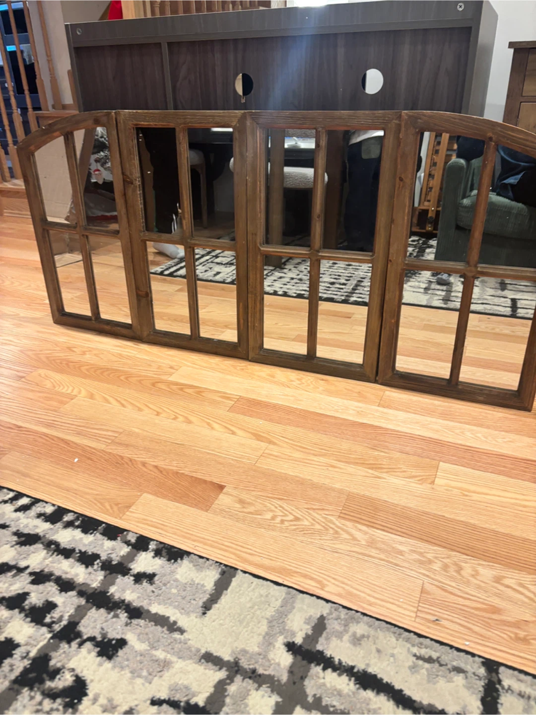 Selling four decorative window mirror panels with a rustic wood frame. Great for adding a unique touch to your home decor!. Available for pickup and delivery.
