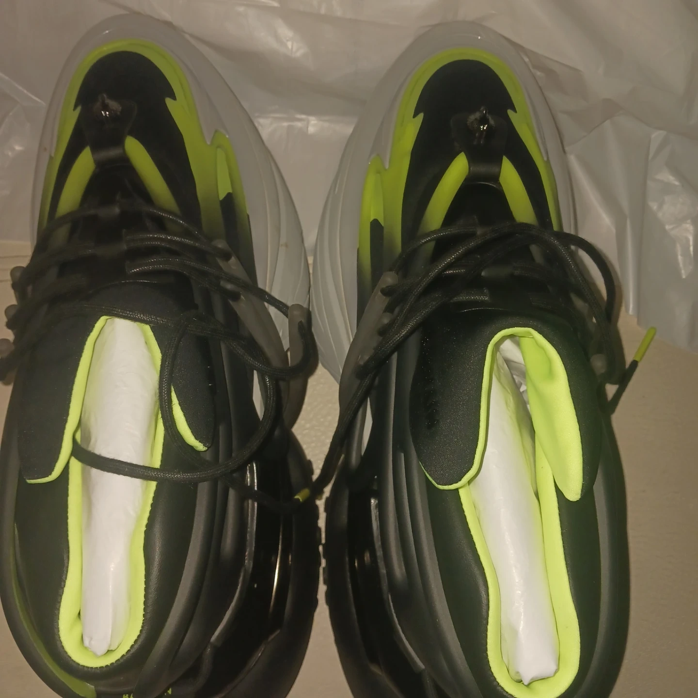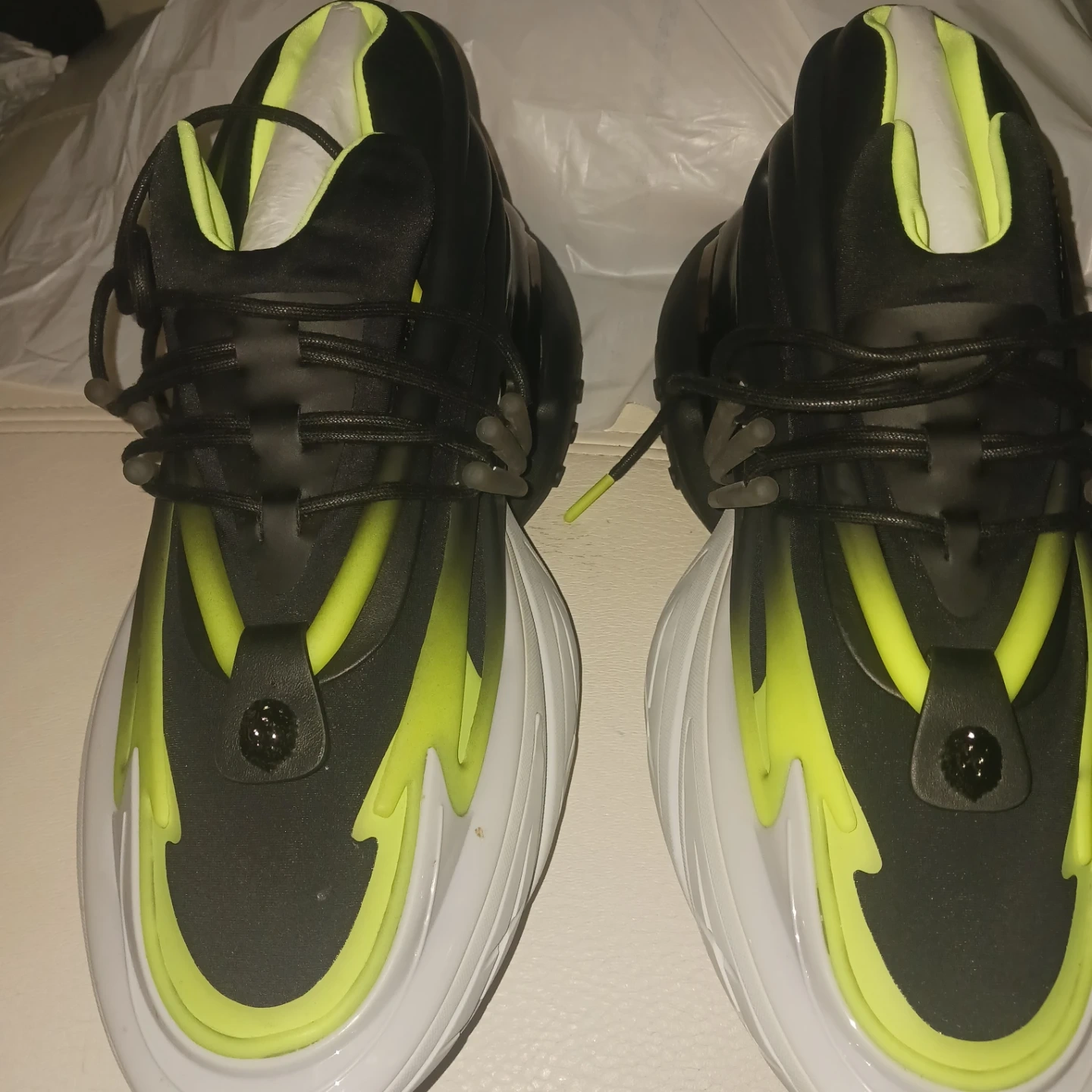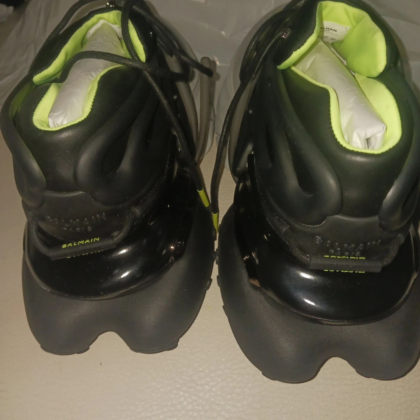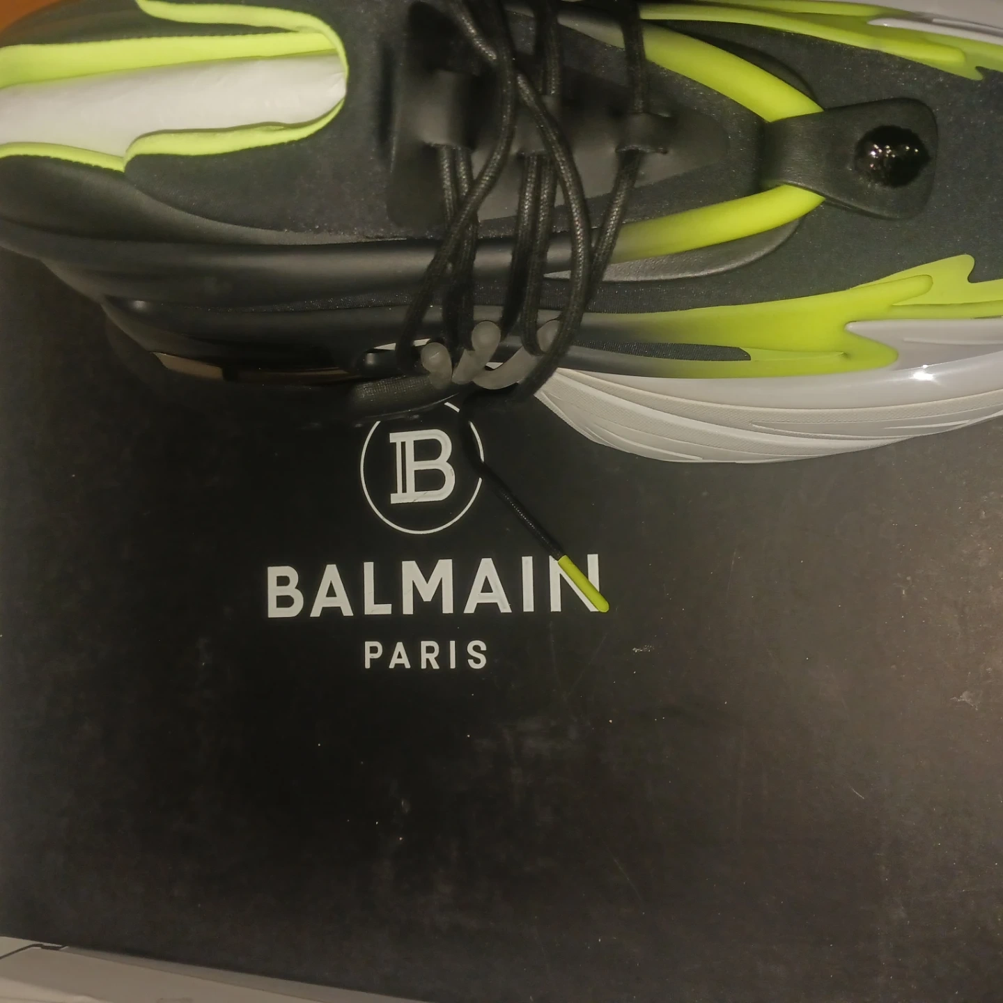 Selling a pair of Balmain Unicorn sneakers in black and neon. These sneakers are in great condition and come with the original box. They are a stylish and unique addition to any wardrobe!
