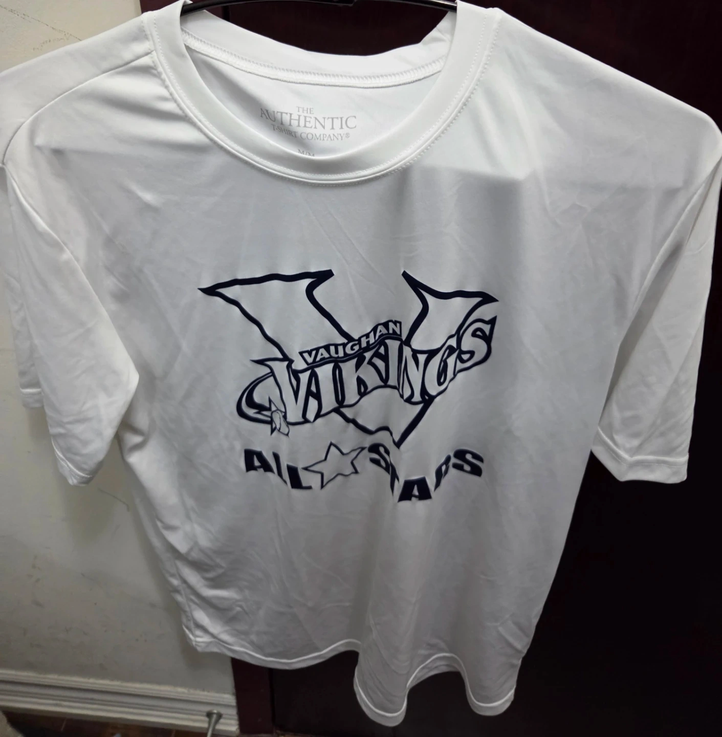 I'm giving for free, a white t-shirt from The Authentic T-Shirt Company! It features a Vaughan Vikings All-Stars logo. The size is M/M. Jersey fabric