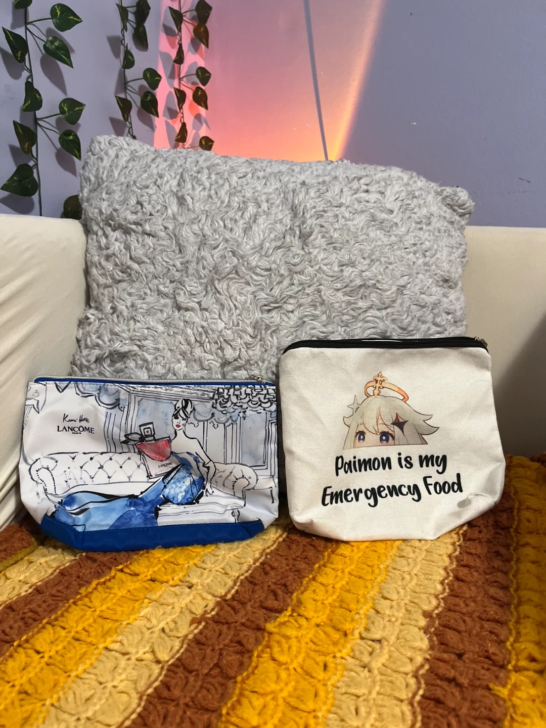 Selling two pouches together! One is a Lancôme cosmetic bag with a cute fashion illustration. The other is a Paimon pouch.