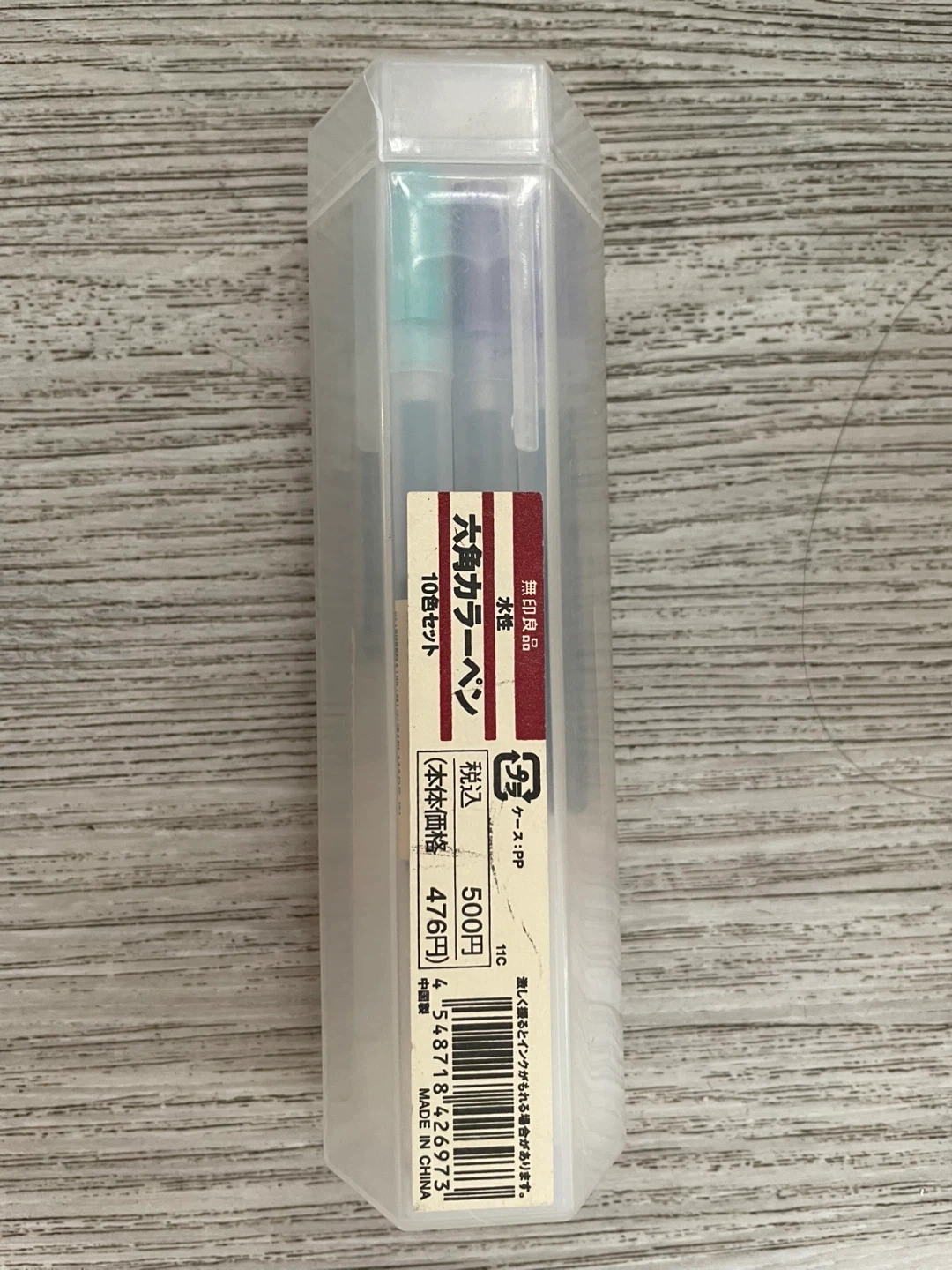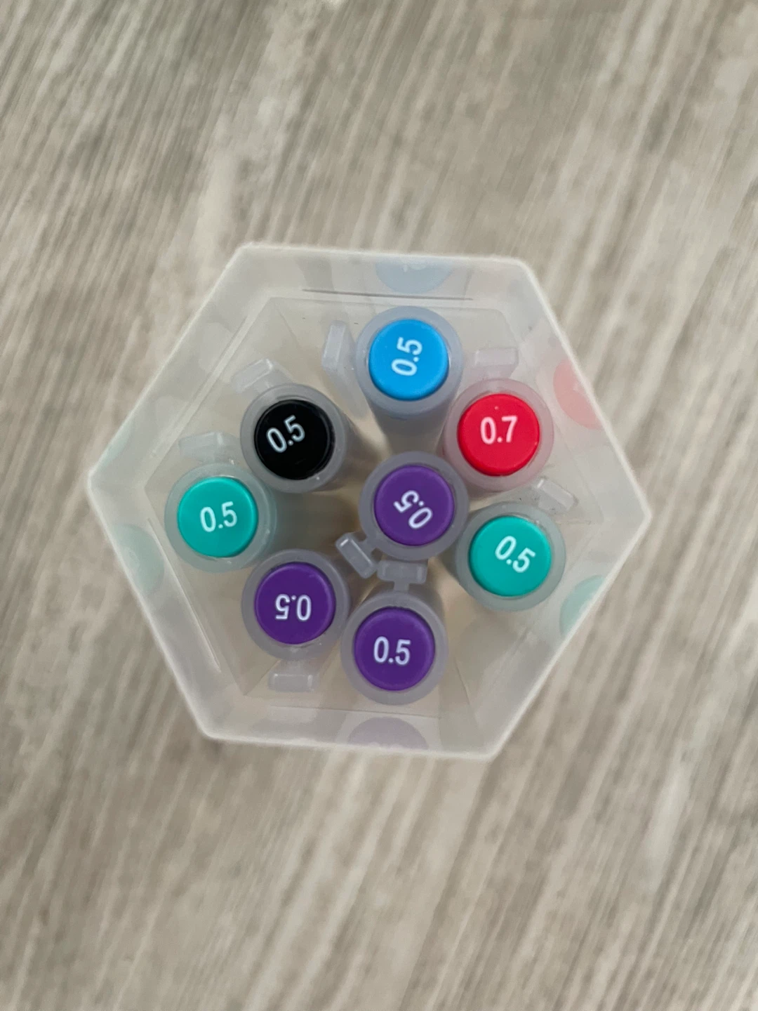 Selling a Muji hexagonal colour pen set! It comes with 8 pens in a variety of colours and sizes. The pens are water-based and come in a clear plastic case.