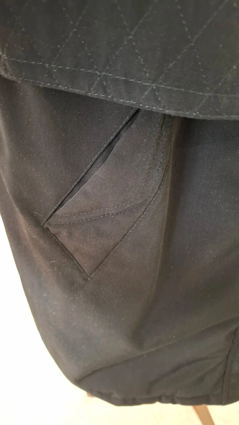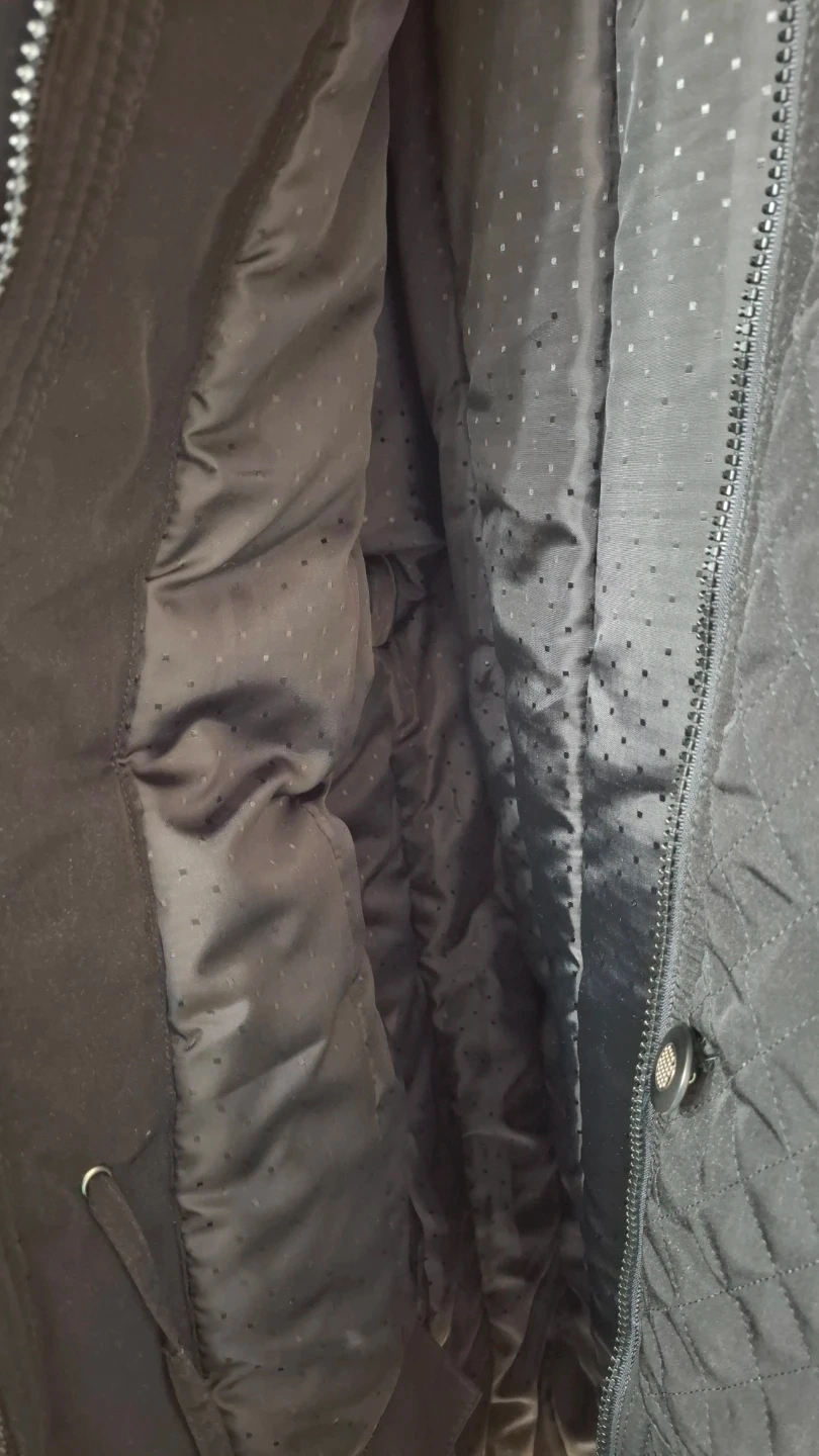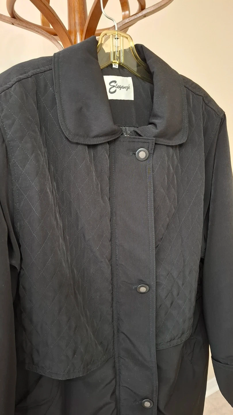 An Eleganzé coat in size XL. It's a stylish black colour with a quilted pattern on the upper part. Comes with a detachable hood.