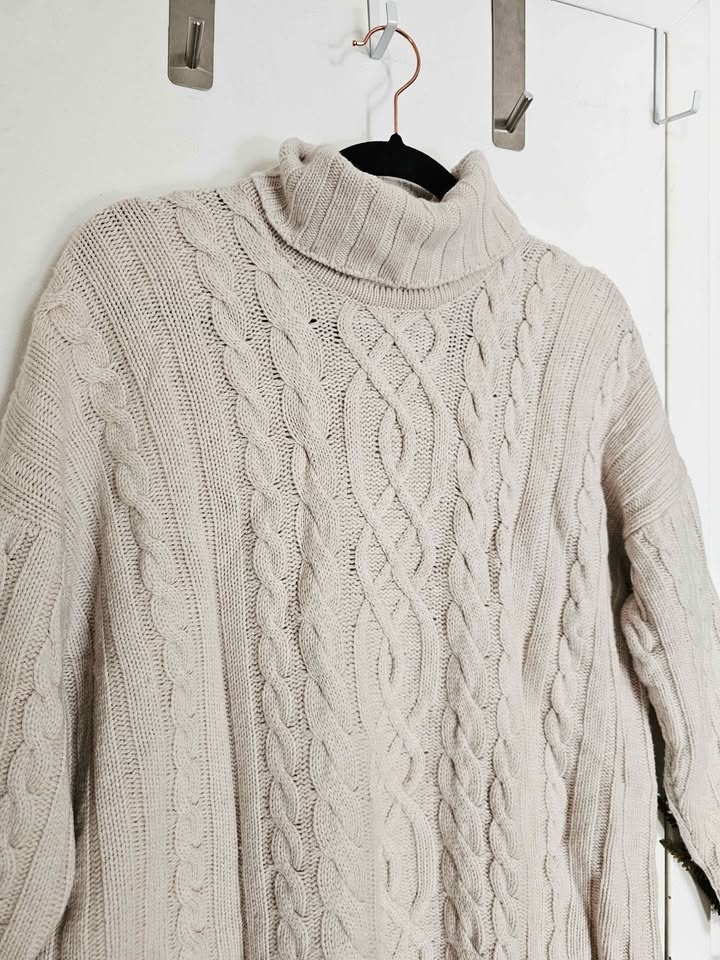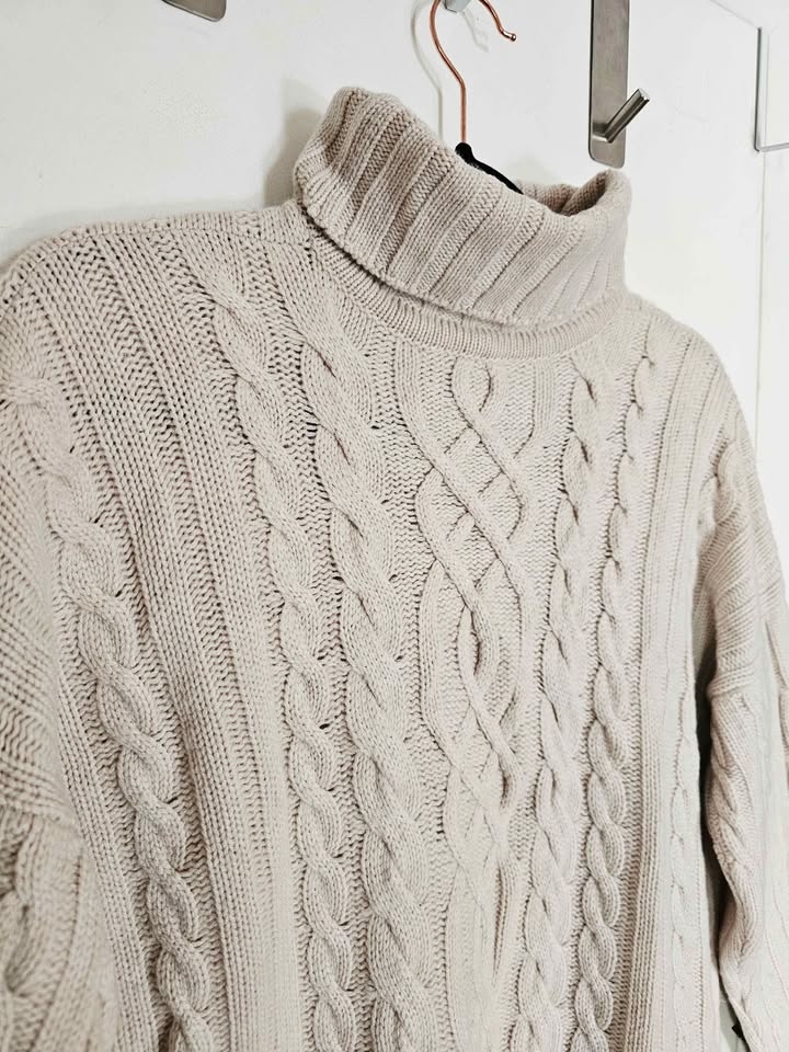 Beautiful HAWICO Scotland heritage cashmere sweater, expertly crafted in the UK from 100% pure cashmere in an oatmeal/ beige/ cream color. Features a classic Aran-inspired cable knit with a substantial, luxuriously soft hand and a timeless turtleneck silhouette. Thick, cozy, ultra soft and super warm.