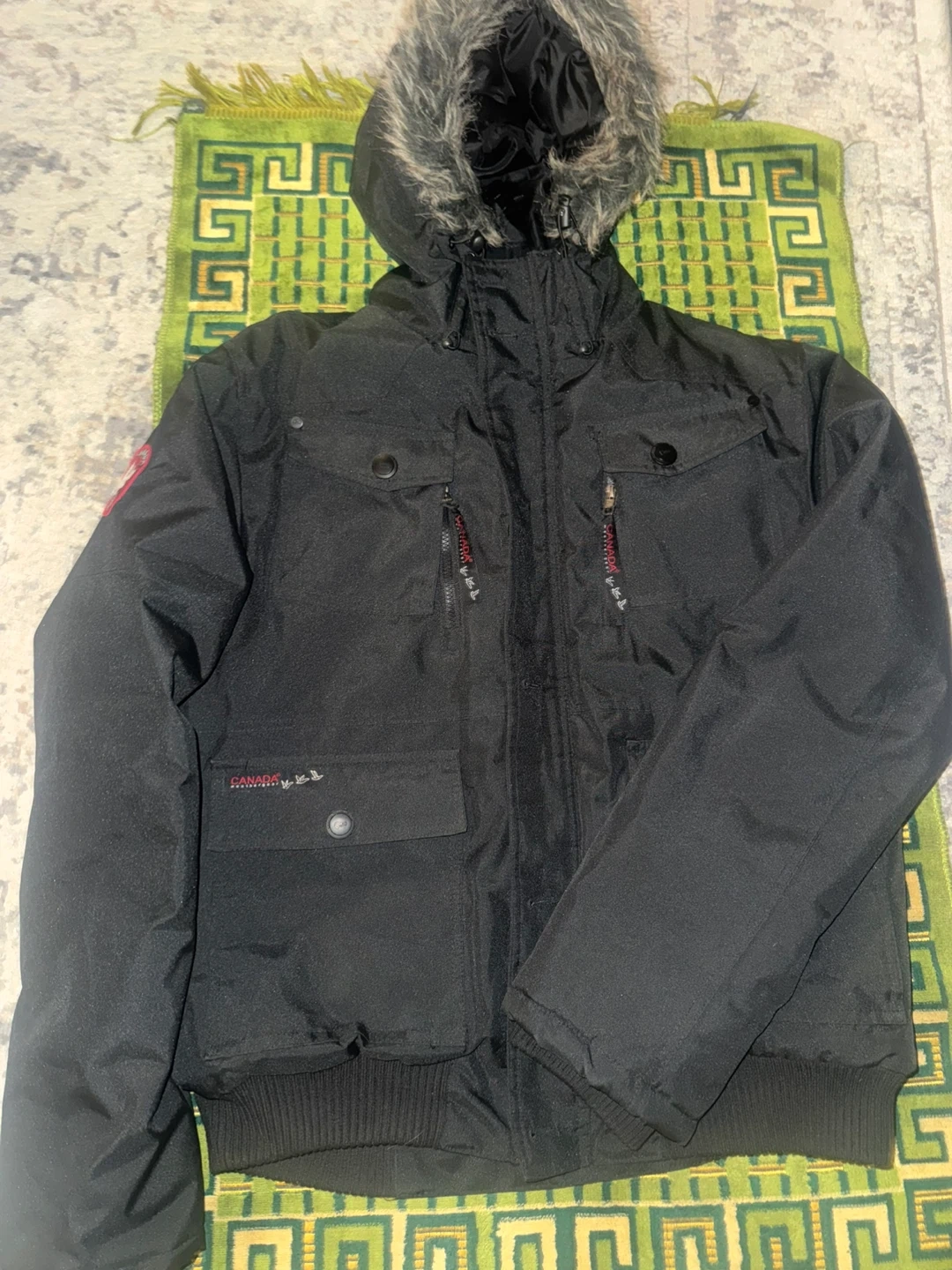 I'm selling a Canada’s Weather Gear men's bomber jacket in black. perfect for the winter It features a faux fur-trimmed hood and plenty of pockets for storage.