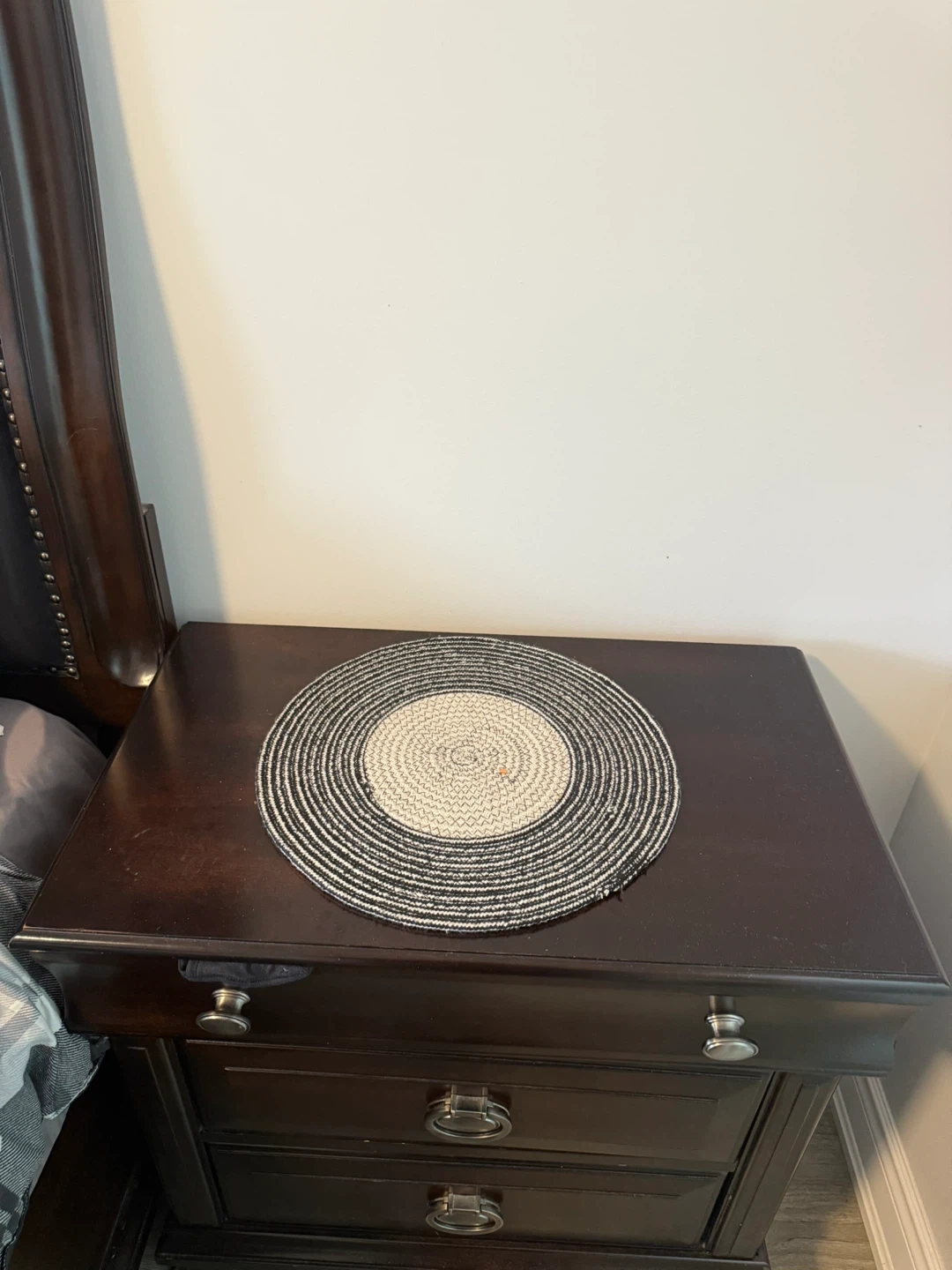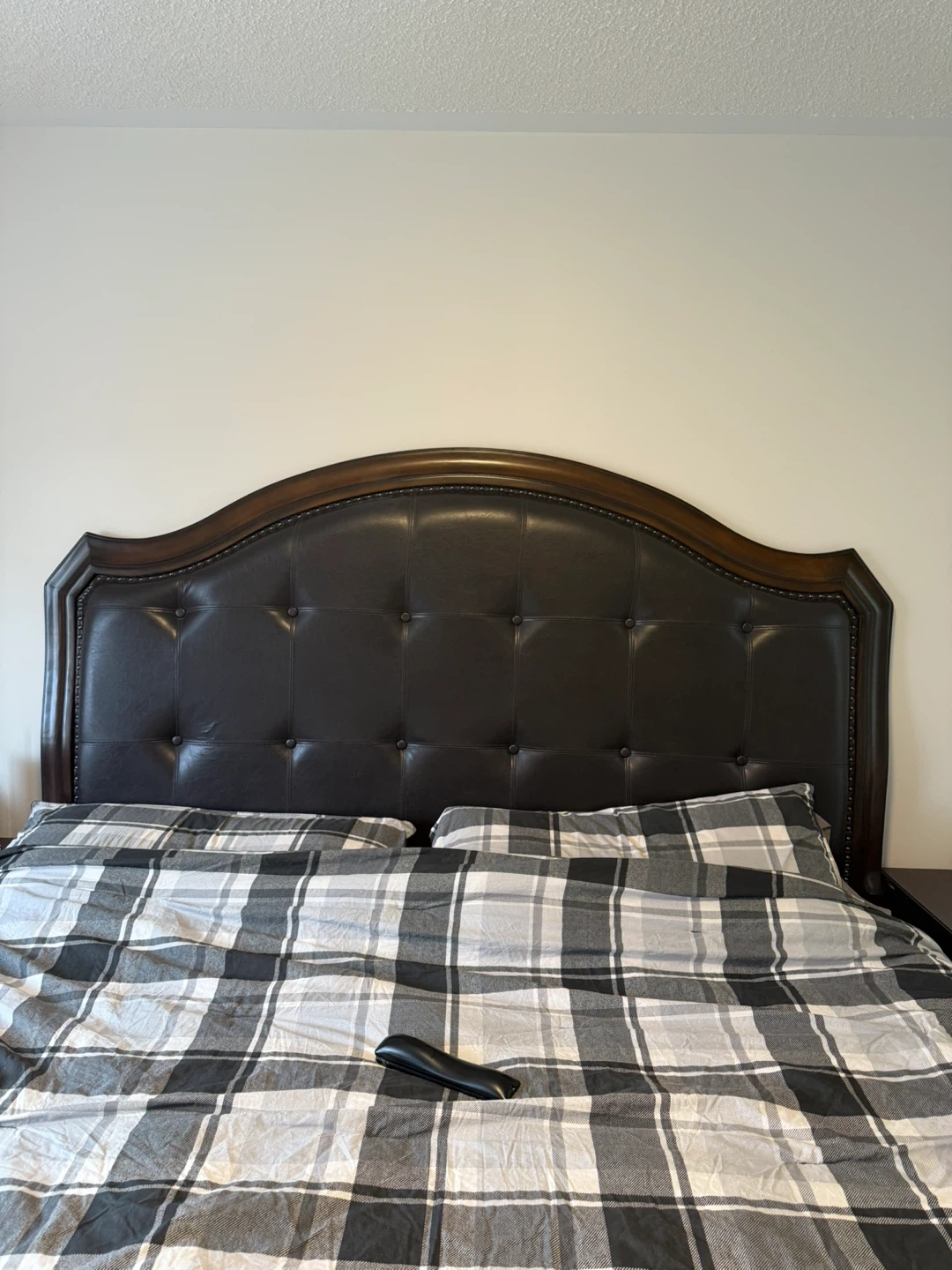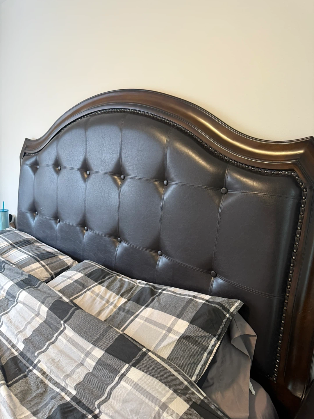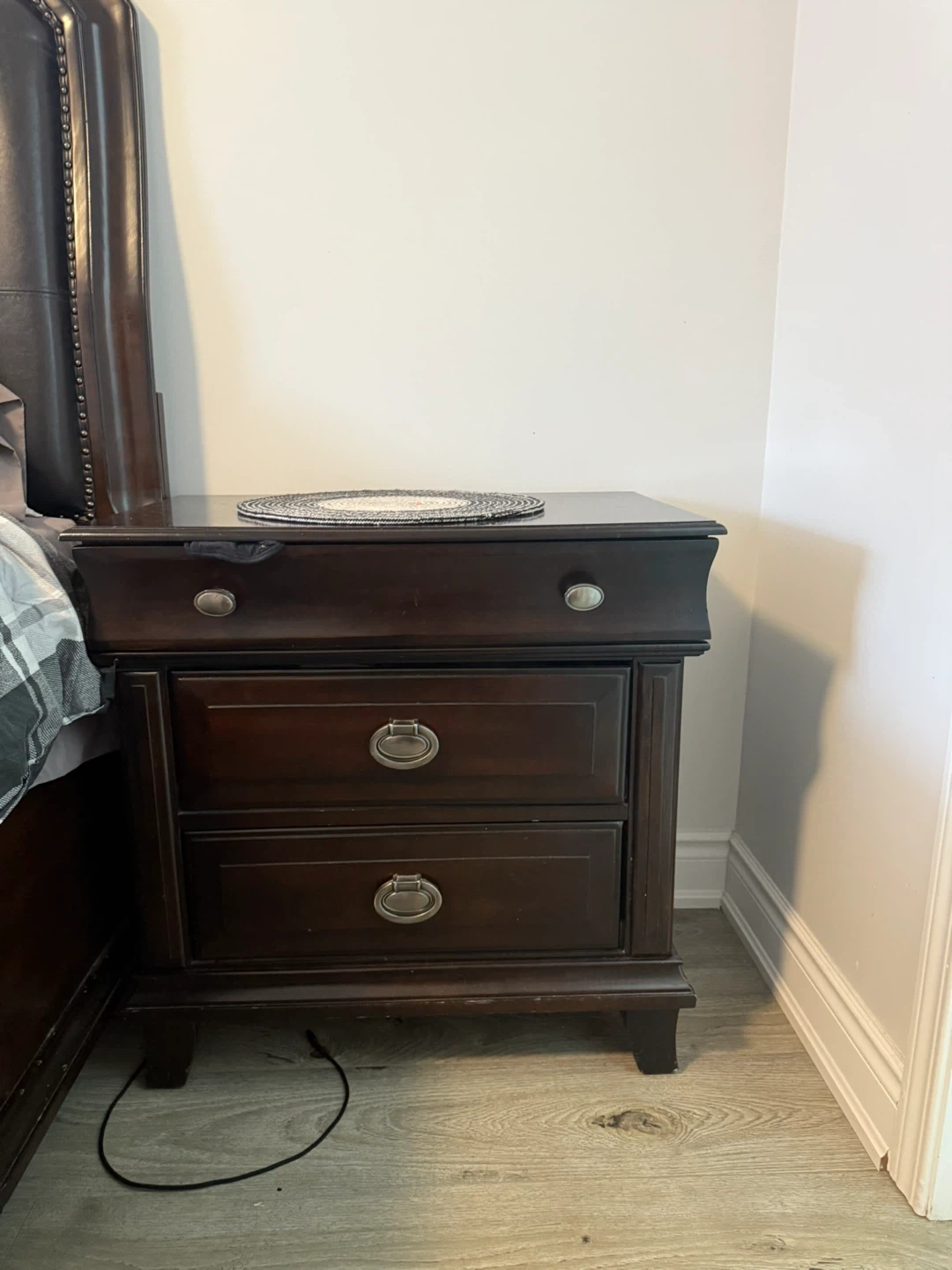 Selling a bedroom set including a bed frame and nightstand. The bed frame has a dark brown, tufted headboard, and the nightstand is also dark brown with two drawers. Both are in good condition and would be a great addition to any bedroom!