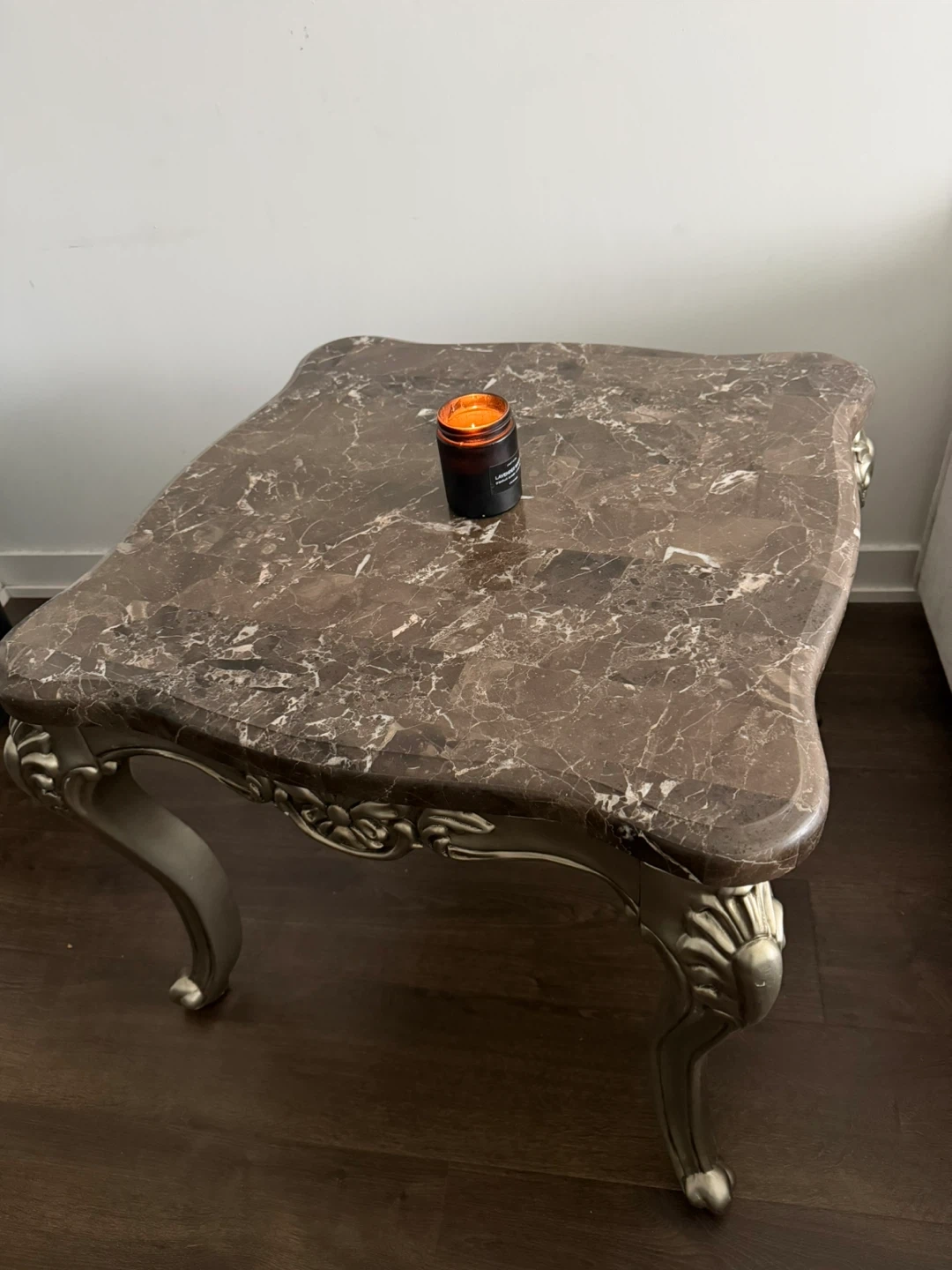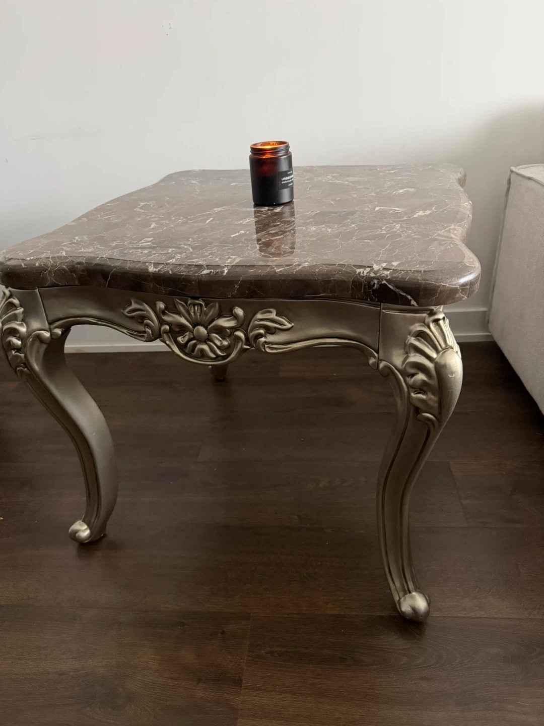 Selling a beautiful coffee table with a faux marble top and ornate silver-painted legs. It's in great condition and would add a touch of elegance to any living room or sitting area. The table features a unique design with curved legs and decorative details.