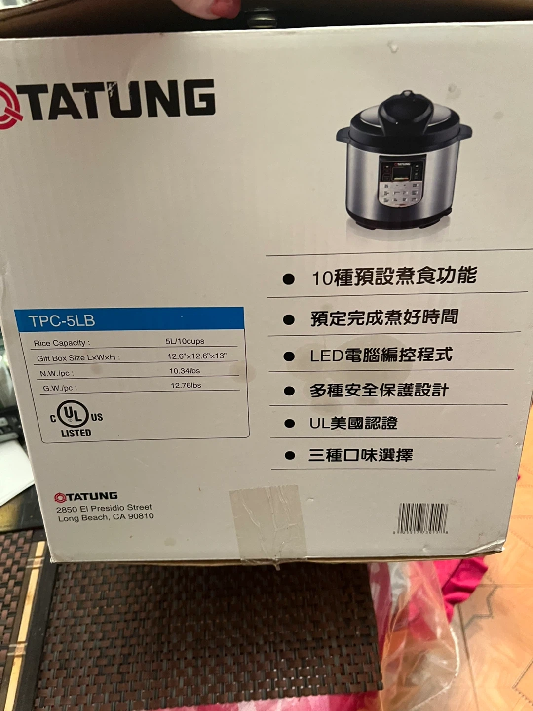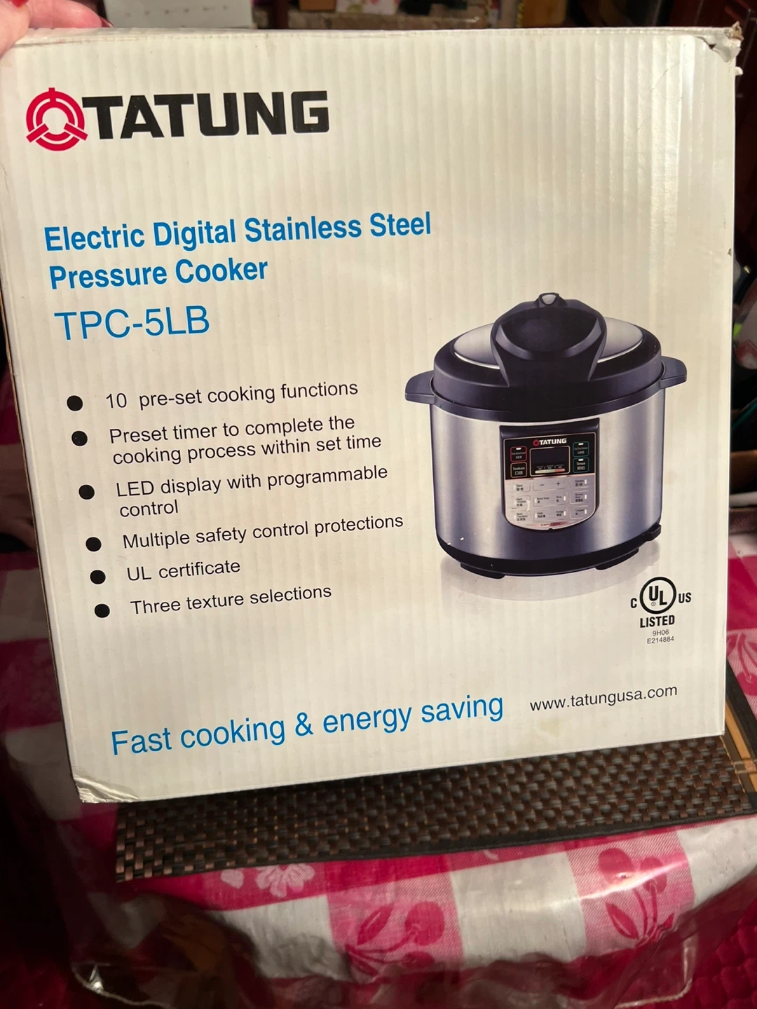Selling a Tatung electric digital stainless steel pressure cooker, model TPC-5LB! It features 10 pre-set cooking functions, a preset timer, an LED display with programmable control, multiple safety control protections, a UL certificate, and three texture selections. It's designed for fast cooking and energy saving.