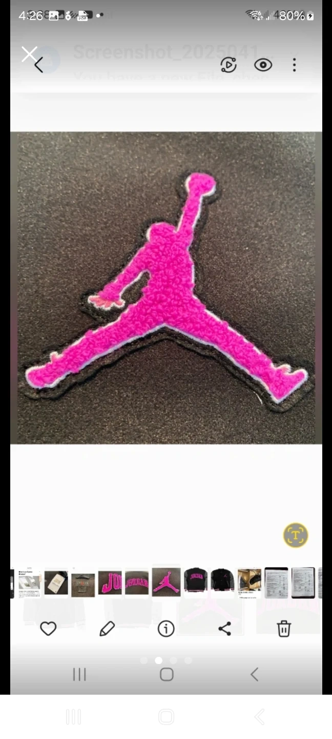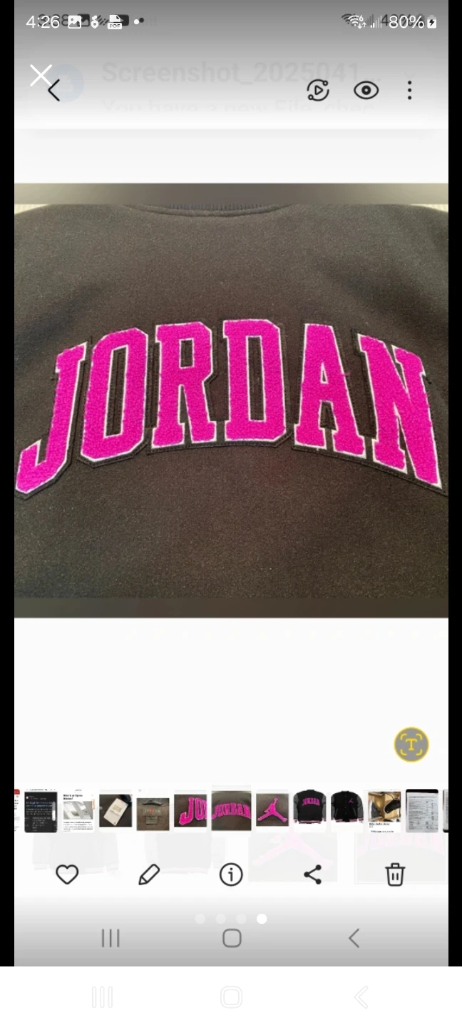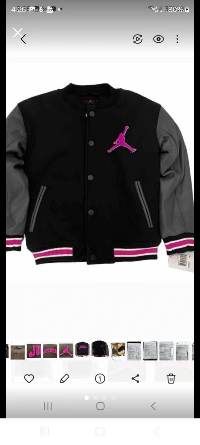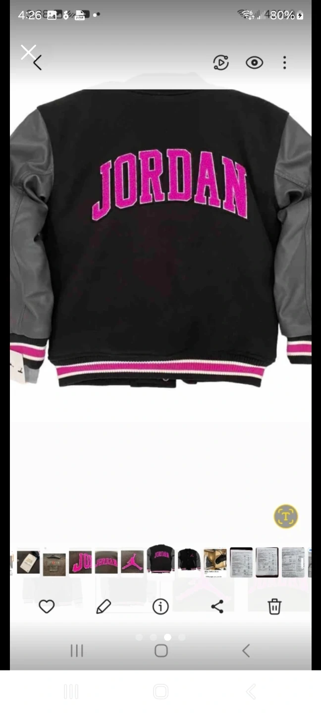 Selling a Jordan varsity jacket for kids! It's black with grey sleeves and has pink accents. The back says "Jordan" in pink lettering, and the front has the iconic Jumpman logo in pink as well. Great for any young Jordan fan!sz 8-10
