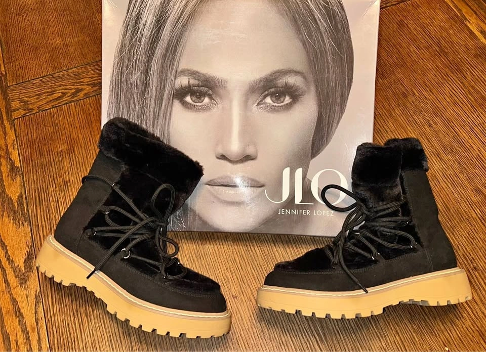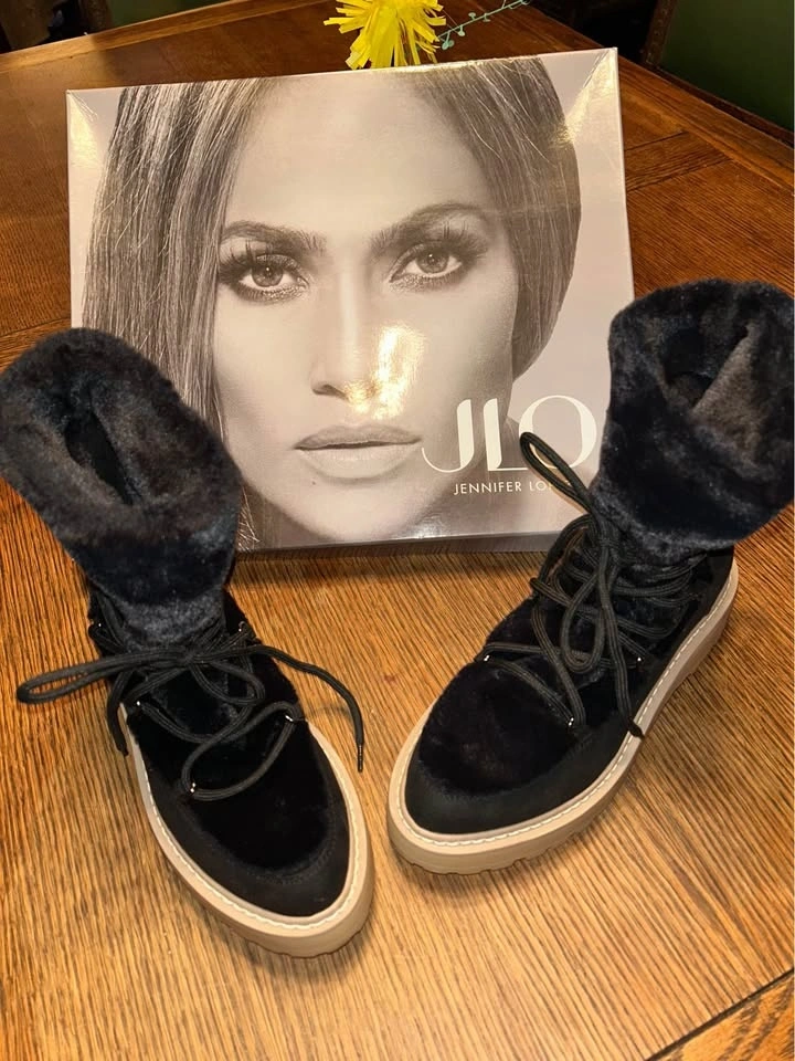 Gorgeous pair of Ginna fuzzy black short lace-up boots from JLo Jennifer Lopez. NEW in box. Faux suede and fur. Lug sole. Size 7. Pickup on the Upper West Side of Manhattan. Great gift!