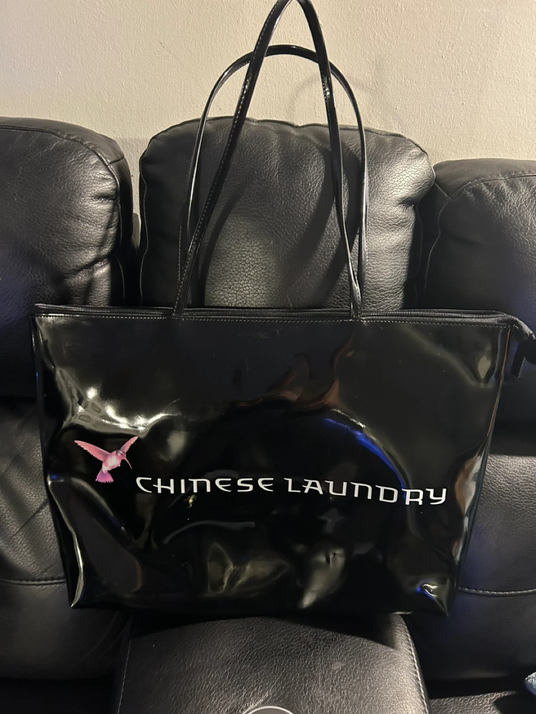 Selling a Chinese Laundry black tote bag! It's in great condition and perfect for carrying your essentials. The bag features the Chinese Laundry logo with a cute hummingbird design. 45 cm x 30 cm