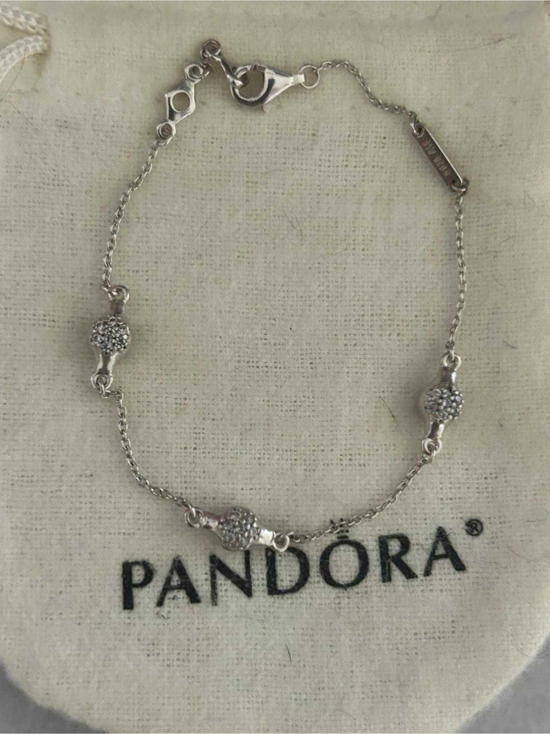 Only worn 2-3x times! Sterling silver with pave CZ stones. Can clasp at 7 or 7.25β lengths. Comes with its original Pandora pouch.