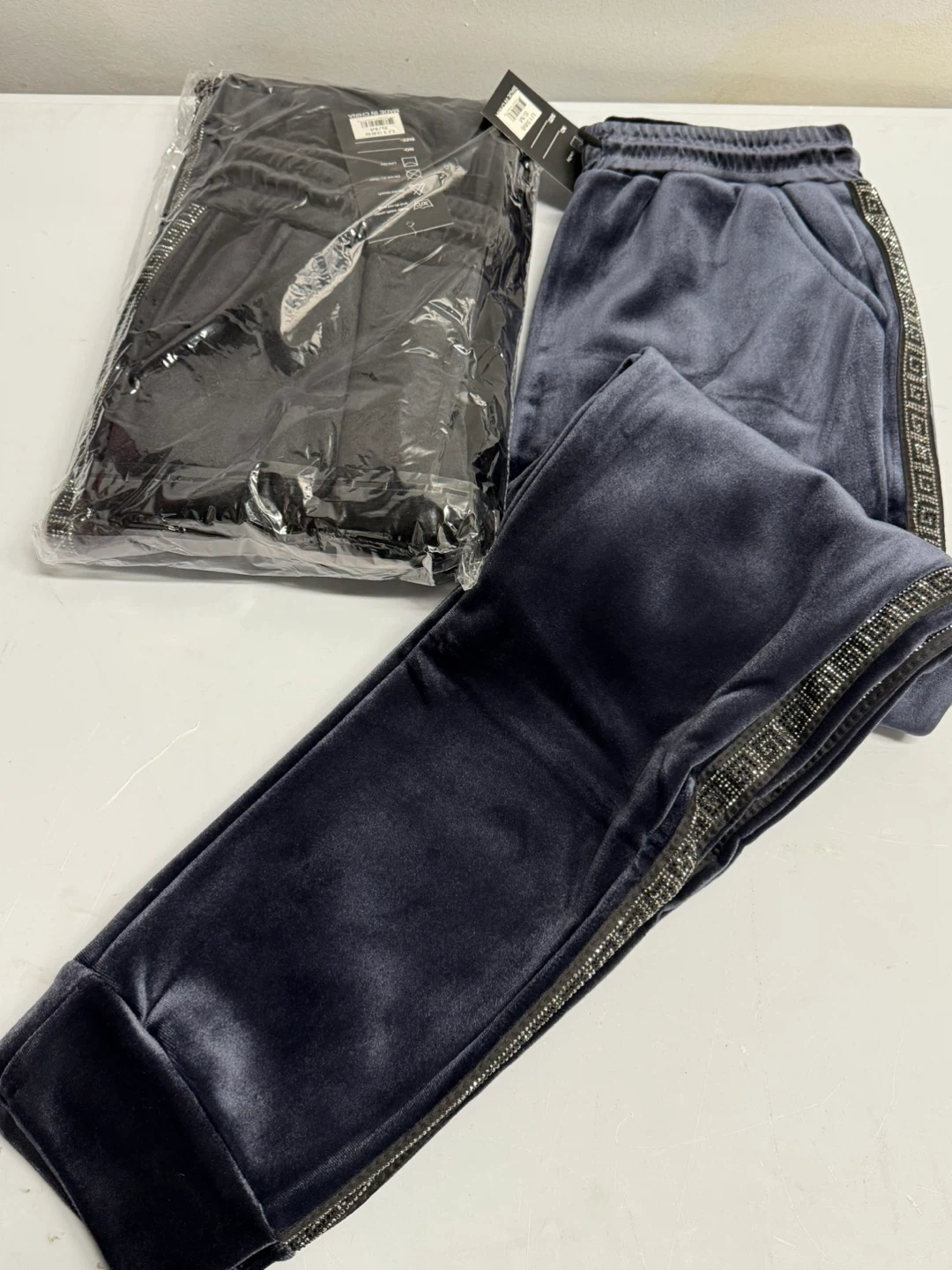 I have a brand new velour tracksuit set for sale! It's still in the original packaging with tags. The set includes both the top and bottom, and the velour material is so soft and comfortable. The tracksuit has a stylish design with a stripe on the side. Perfect for lounging or running errands!