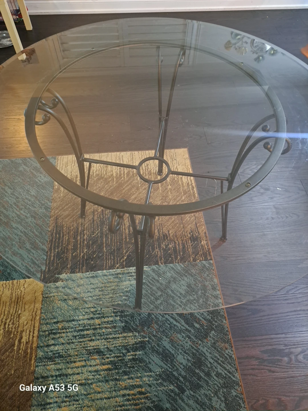 Selling a round glass dining table with four chairs. The table has a metal base and a clear glass top. The chairs have metal frames and beige cushions. It's in great condition and ready for a new dining space!