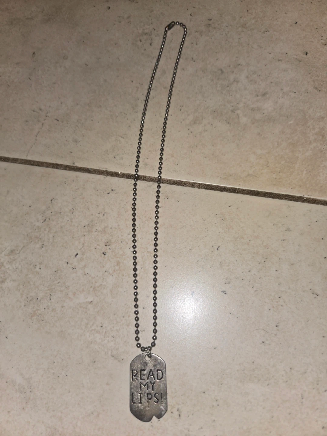Selling a necklace with a dog tag pendant. The pendant has the words "READ MY LIPS!" engraved on it. It's in good condition and ready for a new owner!