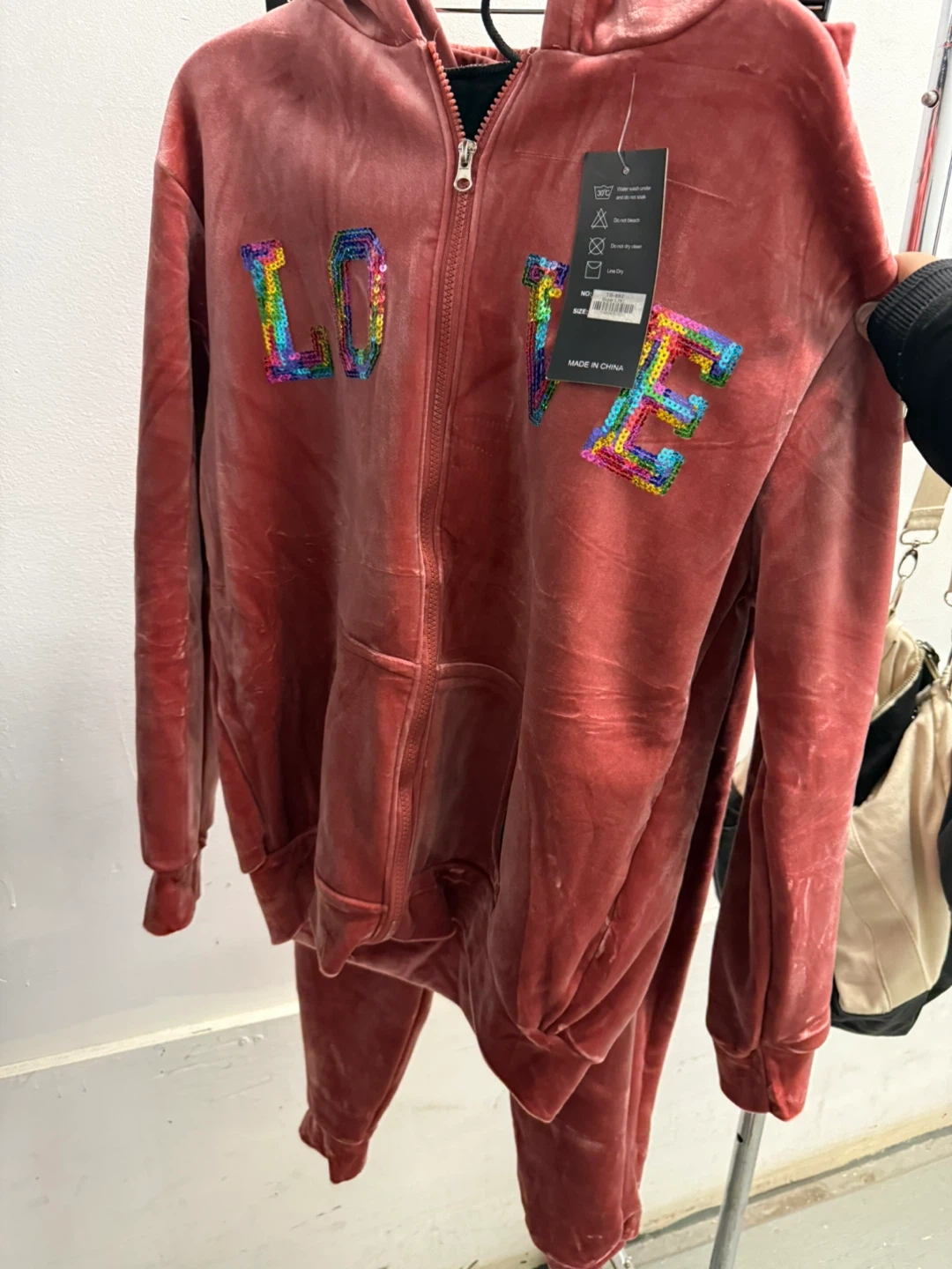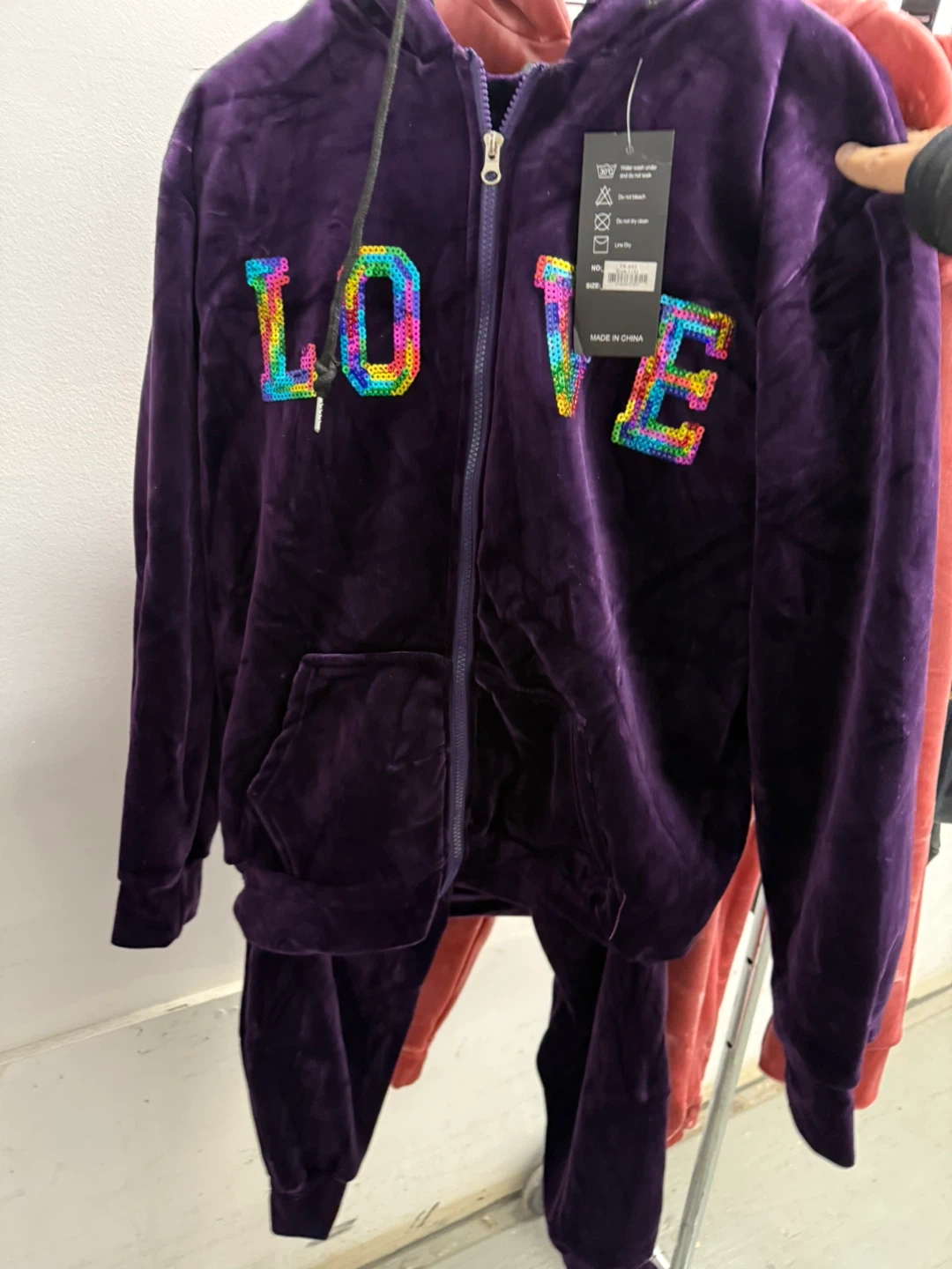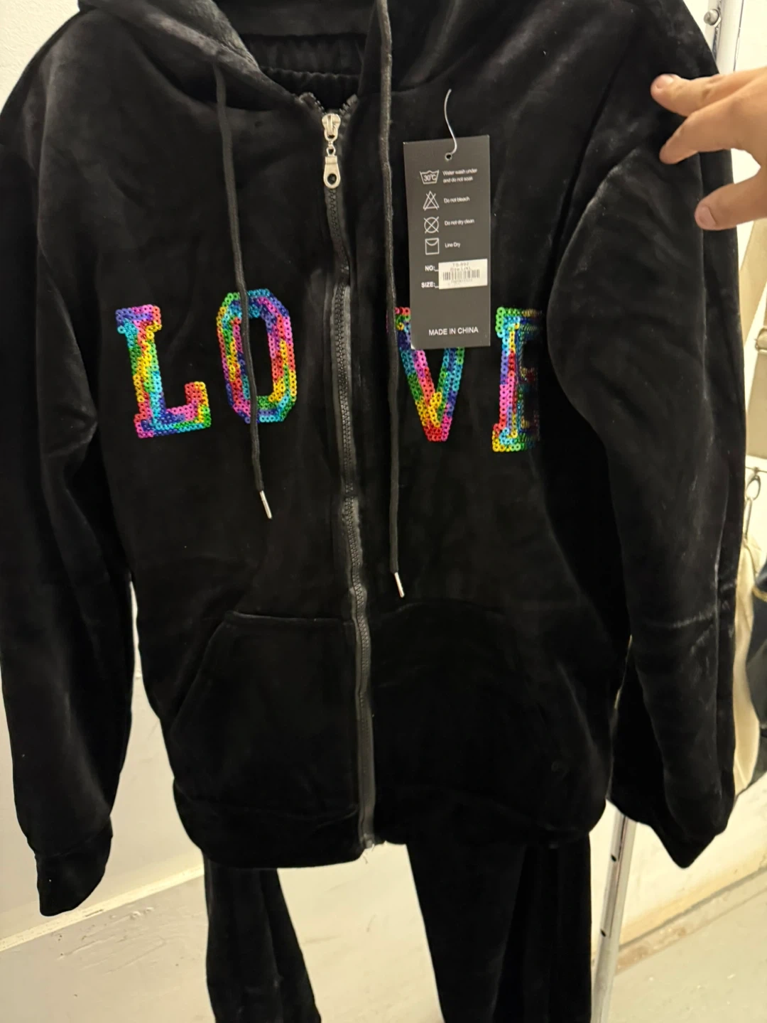 Selling a super cute velvet tracksuit set! It has the word LOVE spelled out in colorful sequins. Perfect for lounging around or making a statement