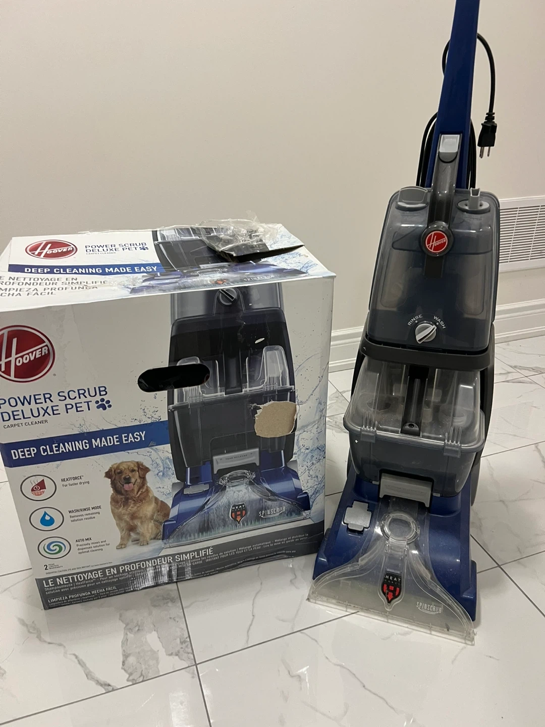 Selling a Hoover Power Scrub Deluxe Pet carpet cleaner. It makes deep cleaning easy with features like HeatForce for faster drying and a wash/rinse mode to remove solution residue. The auto mix function ensures optimal cleaning. Comes with the box